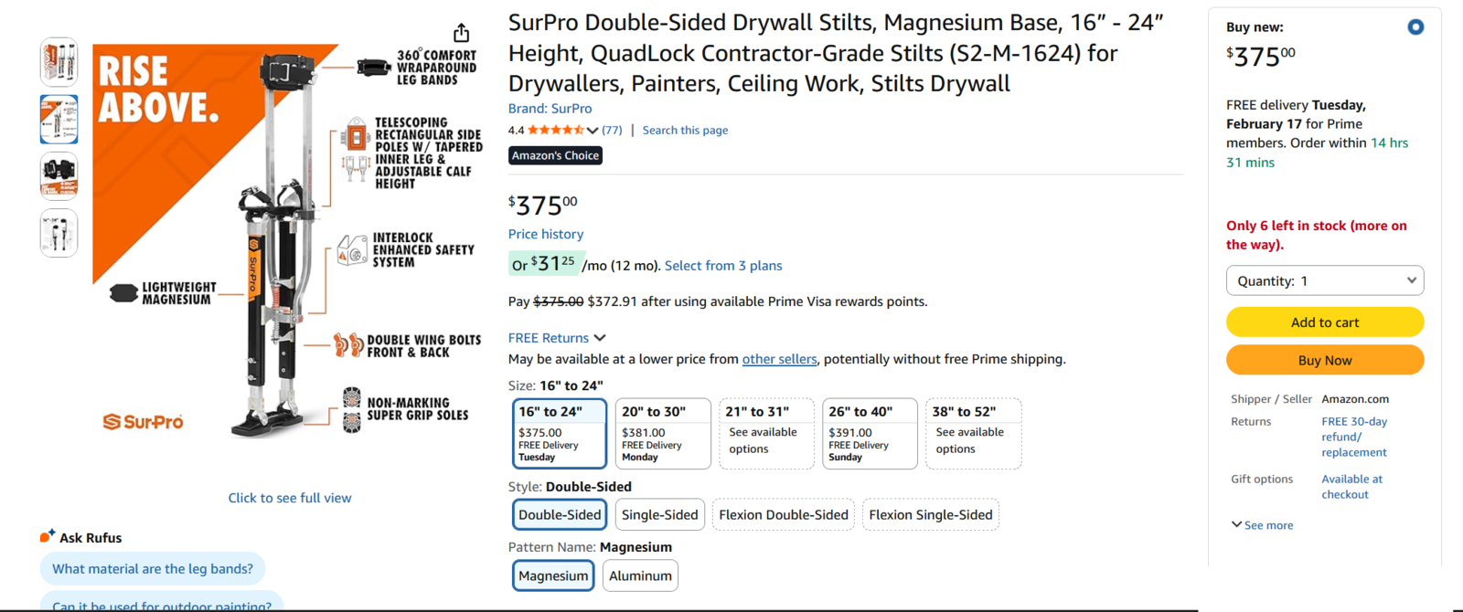 VenmoNew SurPro Double-Sided Drywall Stilts, Magnesium Base, 16” - 24” Height, QuadLock Contractor-Grade Stilts (S2-M-1624) for Drywallers, Painters, Ceiling Work, Stilt performers.