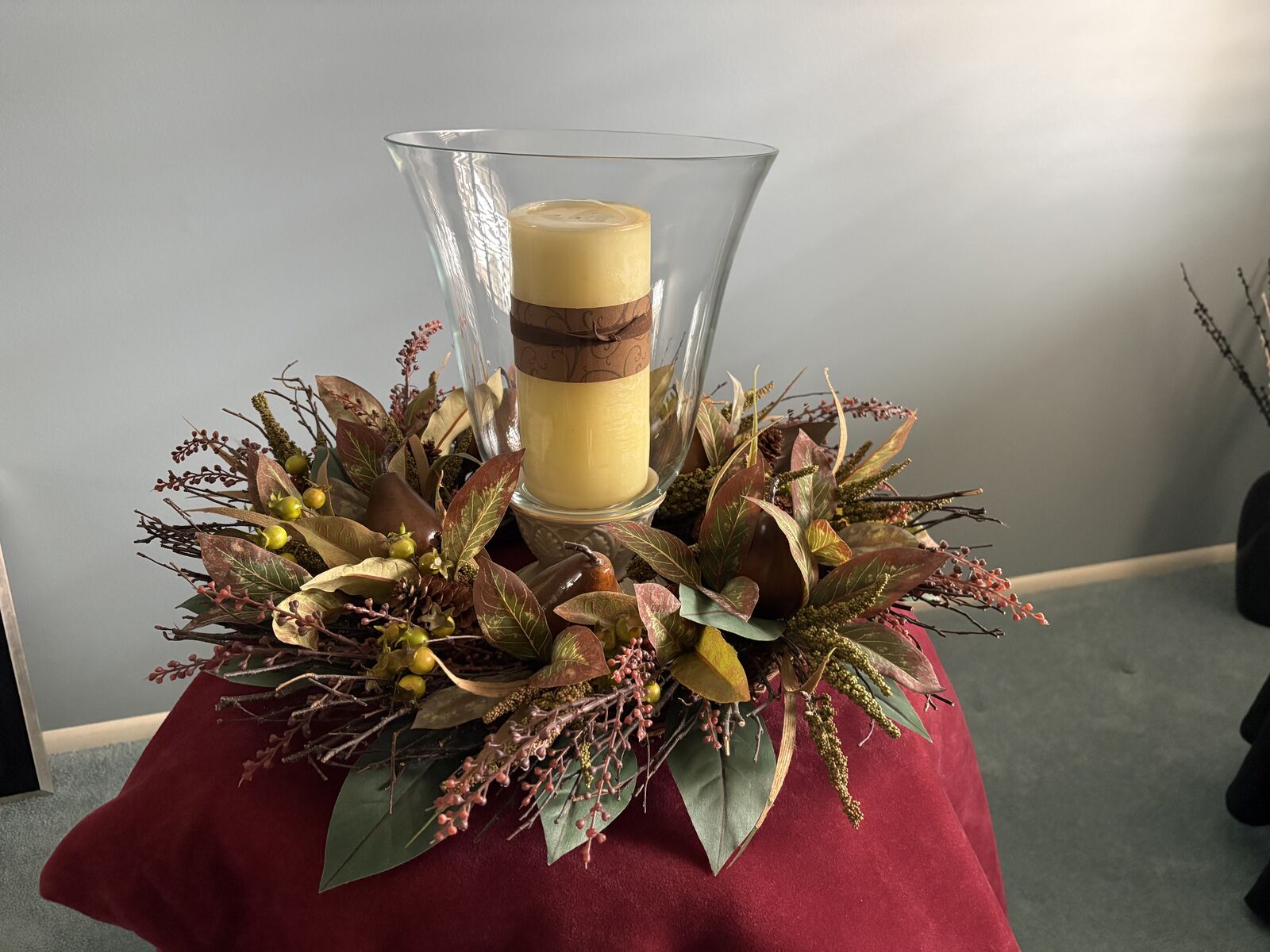 VenmoHurricane Lamp with Lenox Illumination Base; flared 10" diameter hurricane lamp sitting on top of a Lenox illumination base; 14' tall; accent wreath as shown in photo is also available; wreath is faux magnolia and fruit; wreath is 24" diameter; wreath is an additional $15
