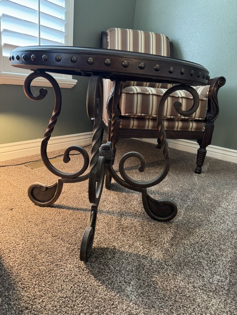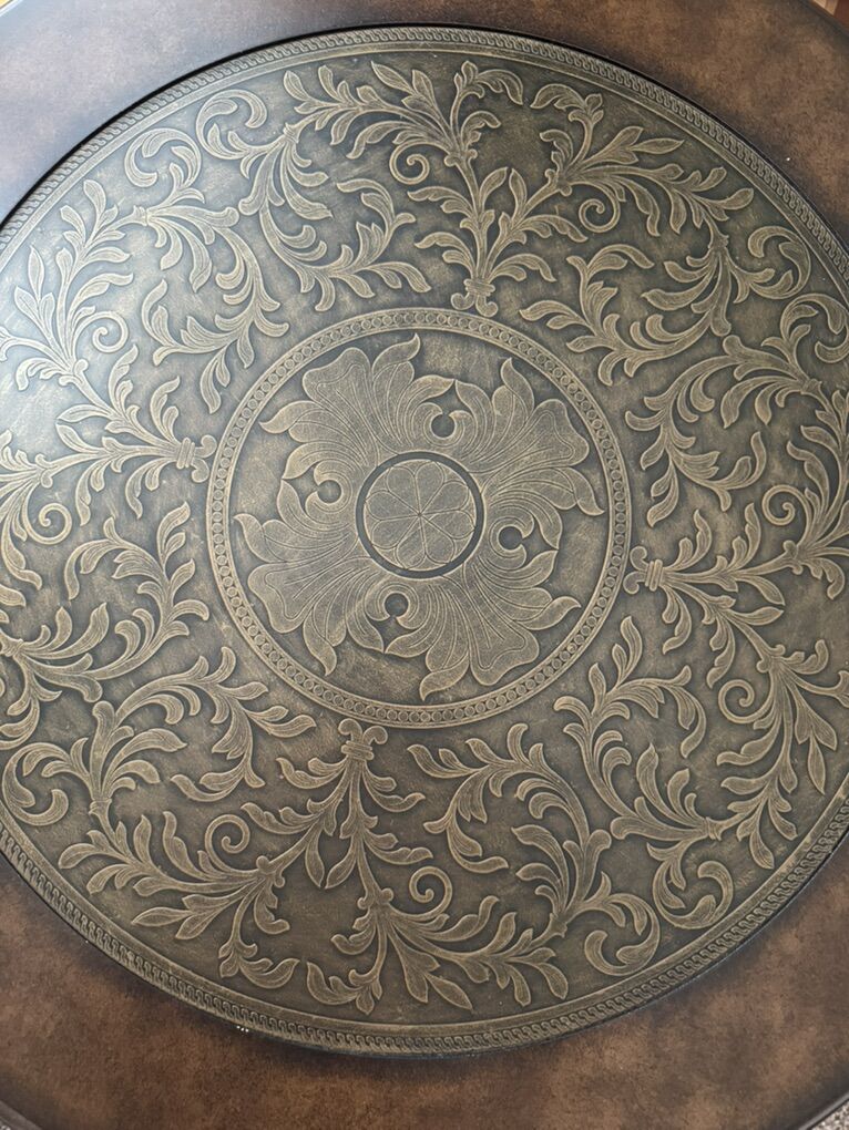 ApplePay26 inches wide. 25 inches tall. Beautiful faux leather inlay. Iron base. Excellent condition.