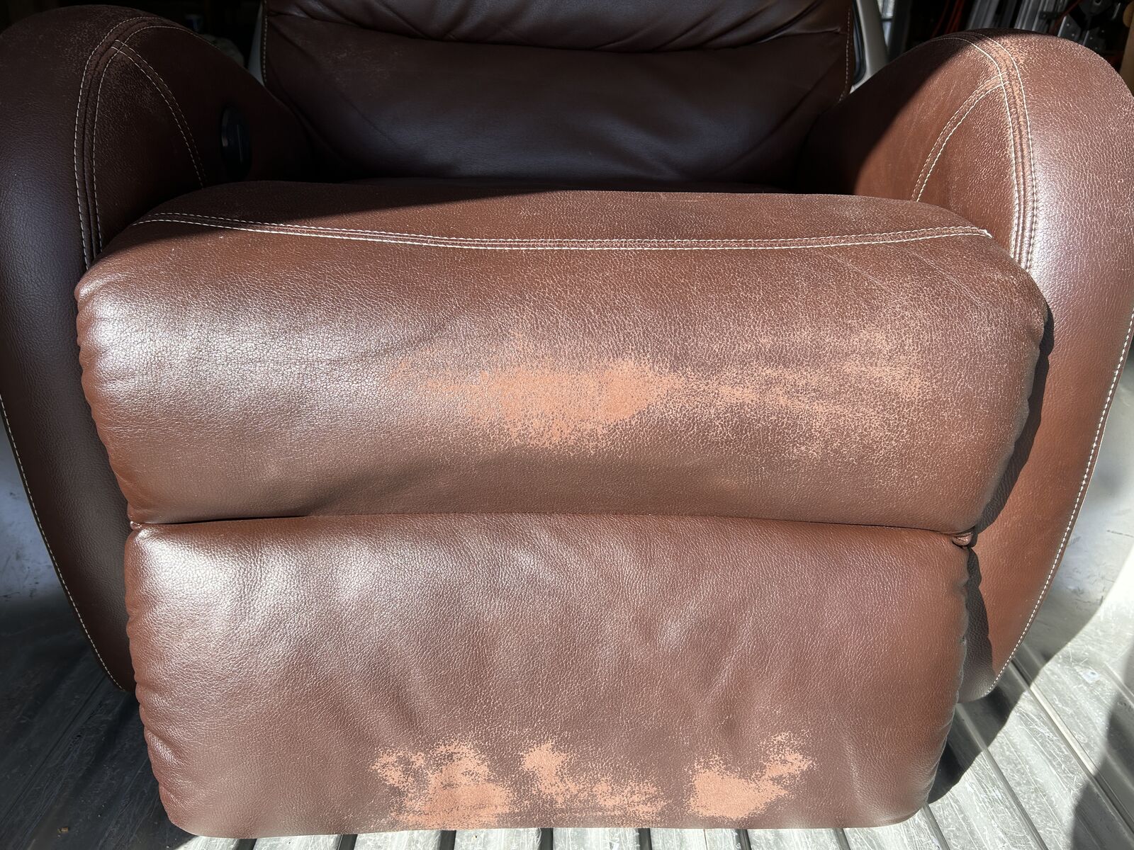 VenmoBrown, plug-in (including possibility of 9-volt battery backup) rocker/recliner. Good overall good condition with light wear visible on arms and headrest and moderate wear on leg and footrest.