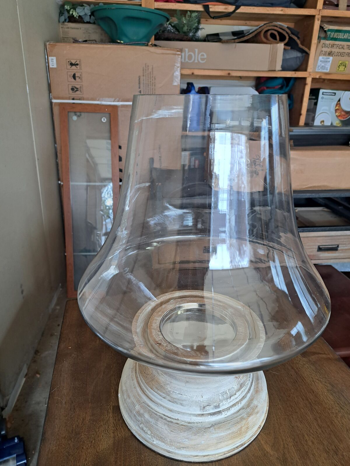 VenmoCreative Co-Op Large Whitewashed Mango Wood & Clear Handblown Glass Hurricane. This was actually $199 new. No longer in production, and is now a vintage item. 13"L x 13"W x 16"H. It was only lightly used. Selling for a bargain.