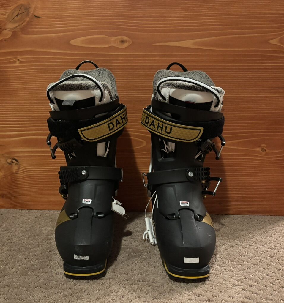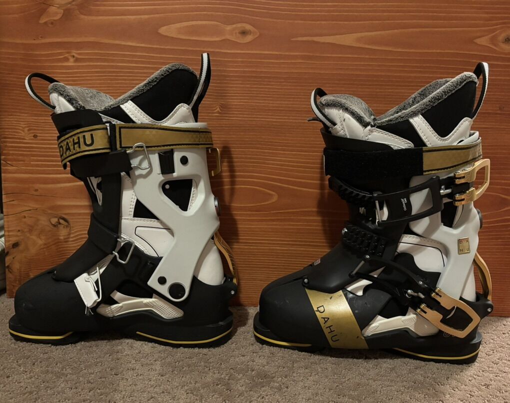 PayPalSwiss made ski boots. They are a season old with maybe 10 days use on them. They are light, super warm and have a unique buckling system that makes them relatively easy to put on for a ski boot. The boot part is separate from the shell so you can remove and use them as normal snow boots (Shown in the pictures). I have upgraded these with Dahu’s forward lean kit, which made them better for steeper terrain. They also have Grip Walk, which gives great traction when walking.