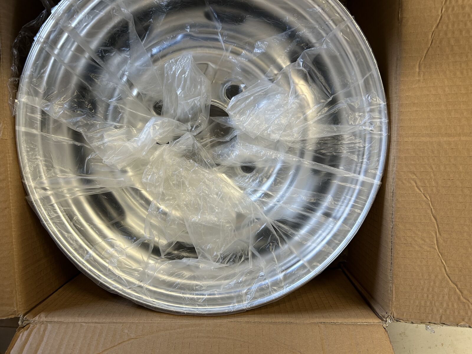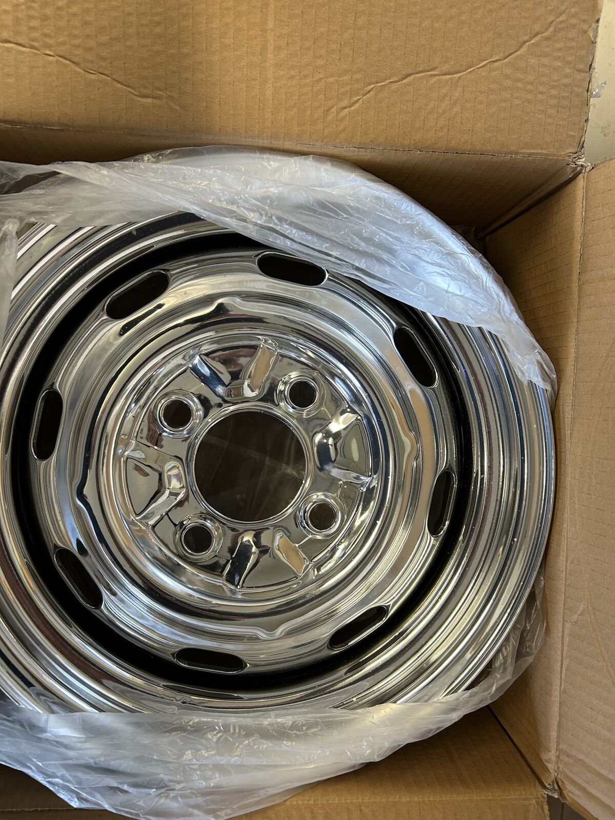 Four-Lug, slotted VW Bug chrome wheel. One only. Fits '68 and newer. Inside hole is 8cm_____ 3 1//8 ". $50.00. Sold the Bug.