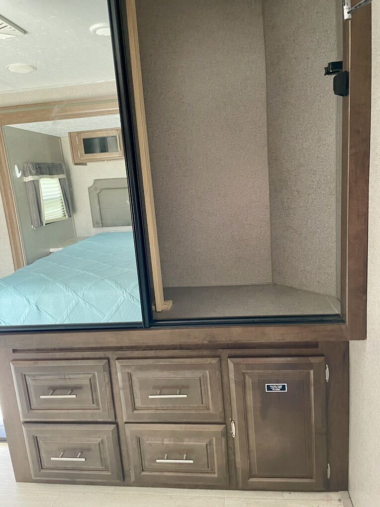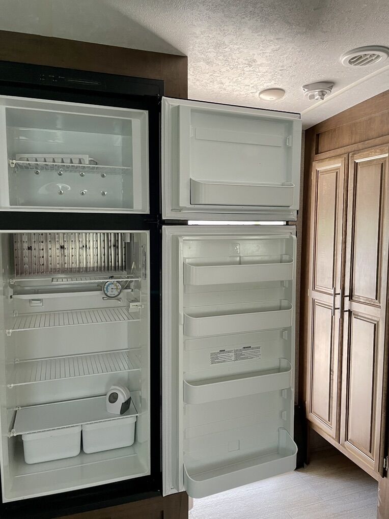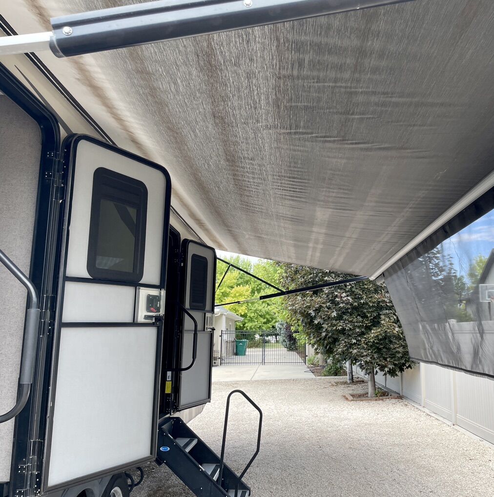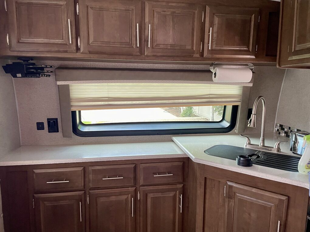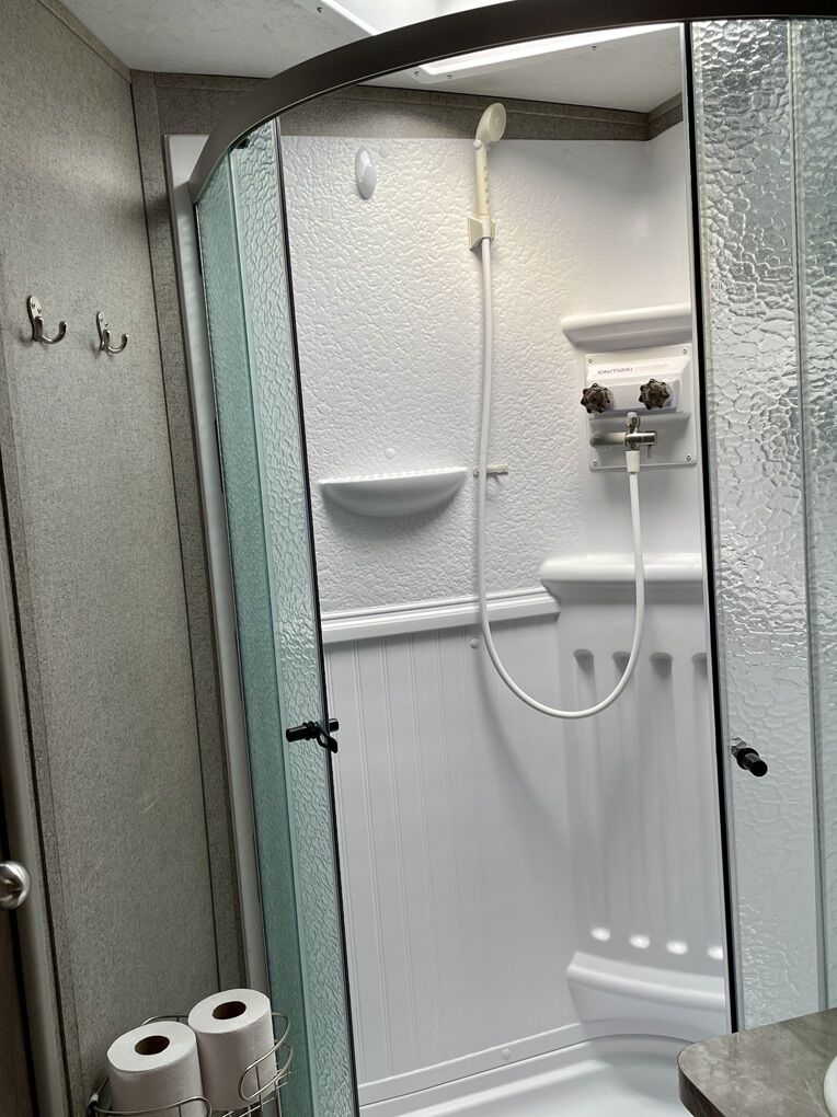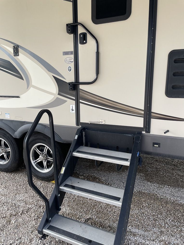 Front large kitchen with window, generously sized appliances, and extra large refrigerator. Bathroom centrally located with XL shower. (dual entrance with custom steps) Large private master with queen size bed and two doors, one to restroom and one to outside exit. Lots of storage. Front and rear bump outs with with retractable awnings 21 foot power with LED lighting Power jack towing equipment with ball and anti-sway bars included. Power leveler supports Twin Propane tanks Duel batteries Undercarriage spare tire storage. Solar power connection Outdoor grill with propane hook up Two air conditioning unit units, front and rear Two ceiling fans TV with CD player Satellite TV unit Fireplace Hide a bed couch and two theater chairs (interchangeable) Outside shower Custom window shades Removable dinette table Large pantry Too heavy duty, electrical cords with connectors Flag pole with American flag Complete set of sewer, pipes, and connectors Two clean water hoses plus black water hose Wheel chocks, and leveling blocks Tire jack