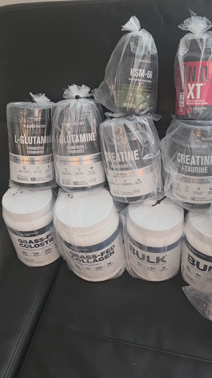 Whey Protein- 1- 55 serving- Milk chocolate 1- 30 serving- Dark Chocolate 1- 30 serving- Milk Chocolate 1- 30 serving- Cinnamon Frenchtoast 1- 30 serving- Cake batter 1- 30 serving- Chocolate Chip cookie 1- 30 serv.- Greens 1- 30 serv.- POST- Straw. lemonade 1- 40 serv.- Hydrate- Tropical punch 1- 60 serv.- BUILD- Fruit Punch 3- 30 serv.- BULK- (Straw. lemonade, tropical punch, & Peach mango) 1- 60 serv.- Creatine HMB- blue rasp. 1- 30 serv- Creatine HMB-Fruitpunch 1- 30 serv.- Collagen- vanilla 1- 30 serv.- Colostrum- Chocolate 1- 60 serv.- Creatine Monohydrate 1- 60 serv.- Creatine+Taurine 2- 100 serv.- L-Glutamine 1- 60 serv.- KSM-66 1- 90 serv.- N.O.XT- nitric oxide booster