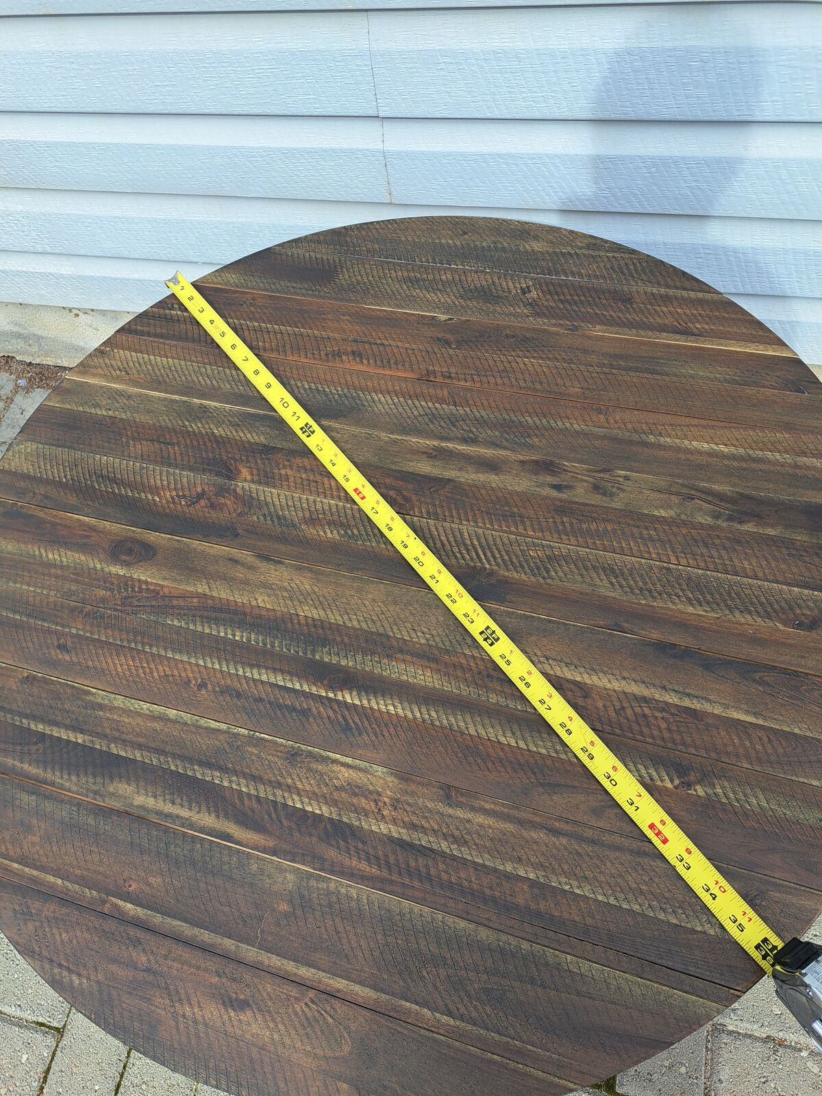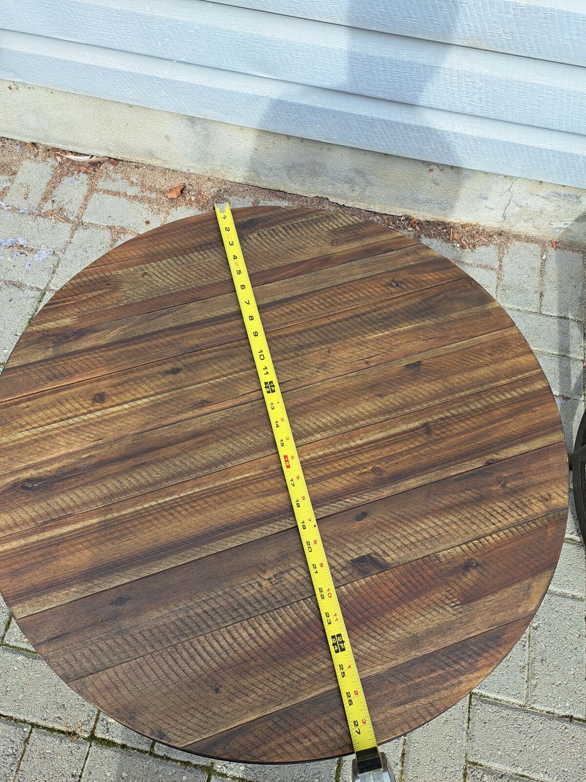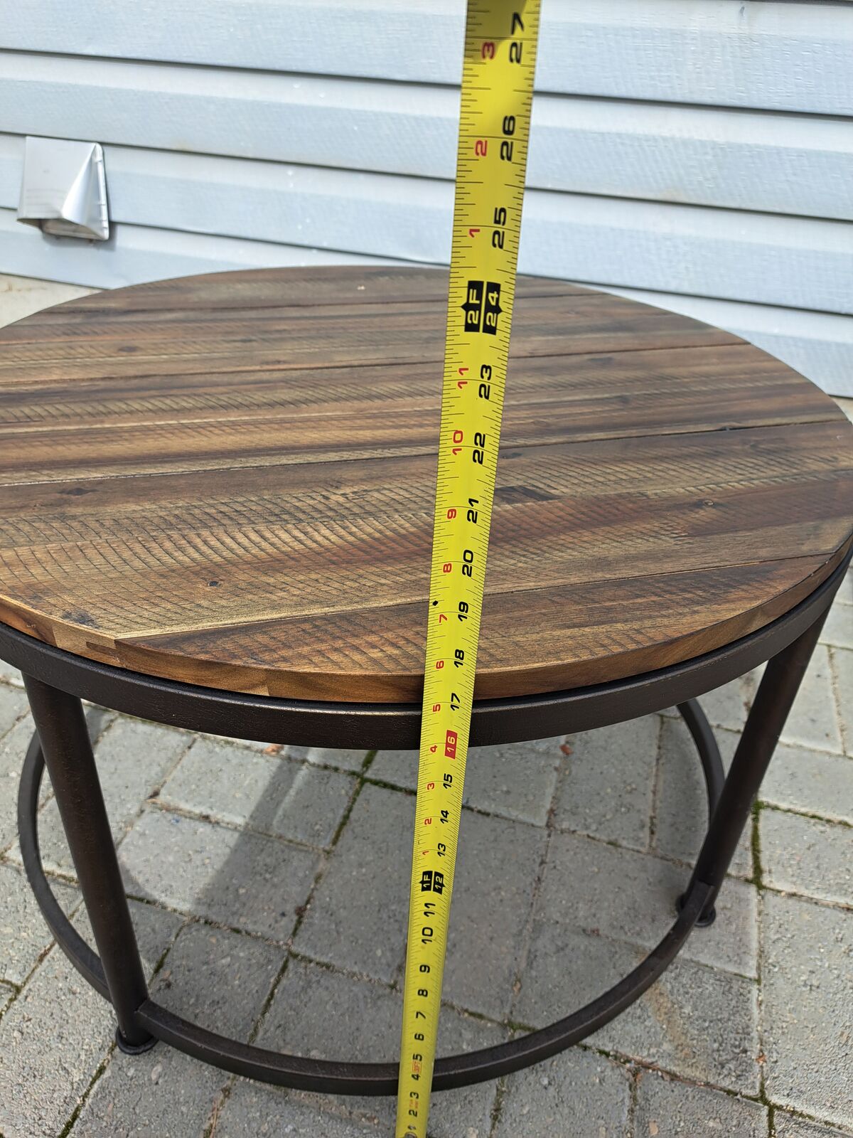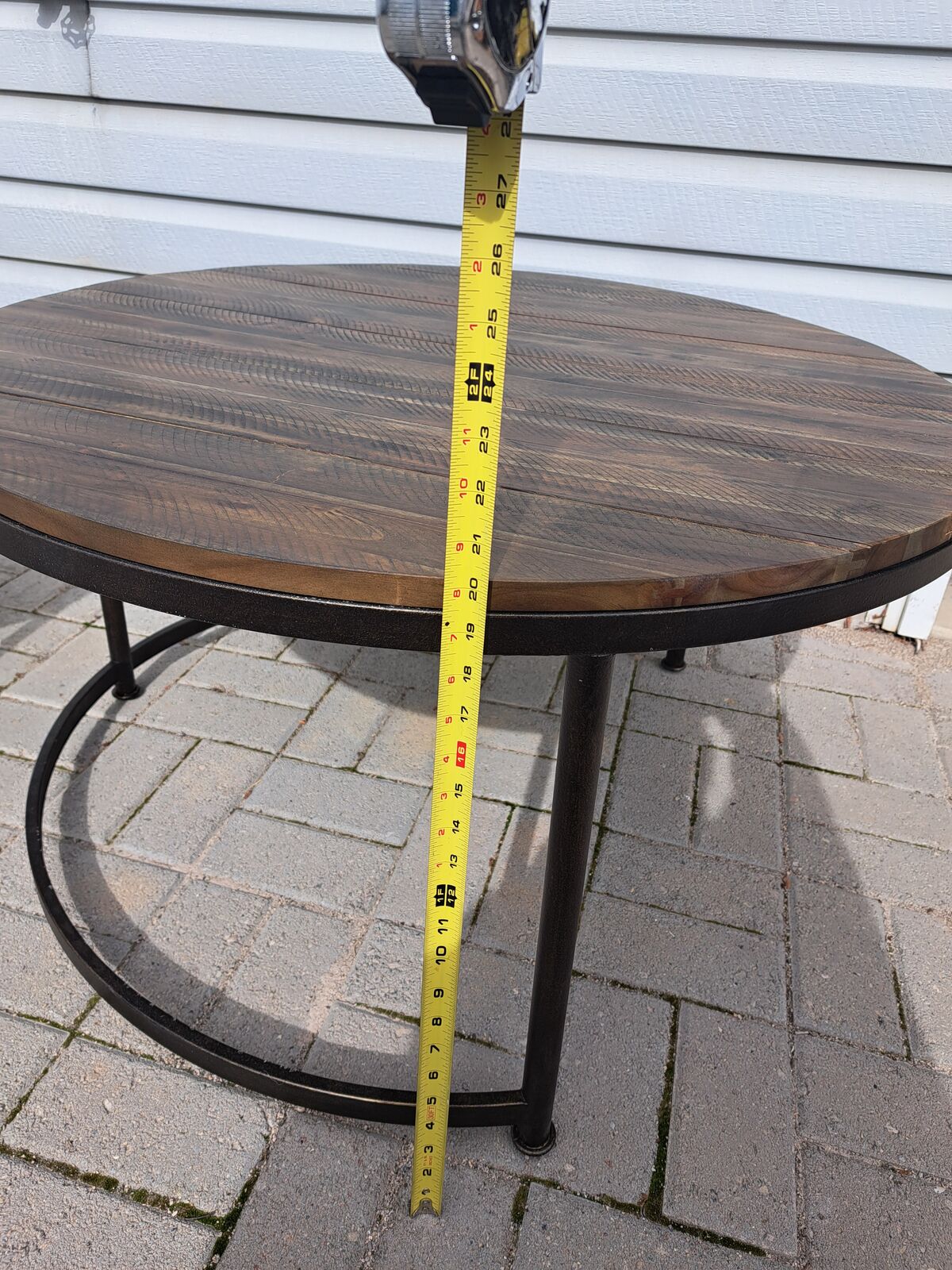 VenmoSome minor scratches on metal from use, but otherwise still in great condition. Being stored nicely in my garage until they sell. These are more quality than the knockoffs you can find online that are made of particle board (again ours have solid wood tops) and that don't have the heavy welded metal bases that ours have. They are quite large with the larger table measuring 36" W x 20 1/4" H.