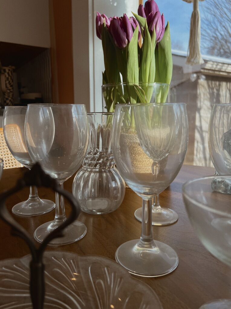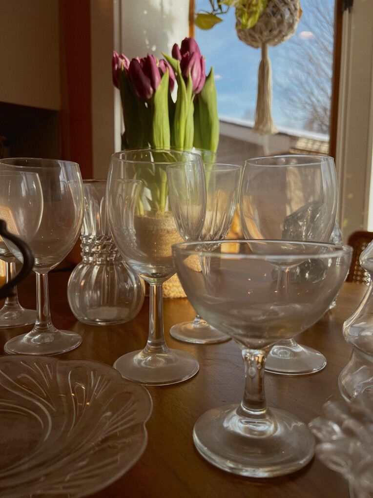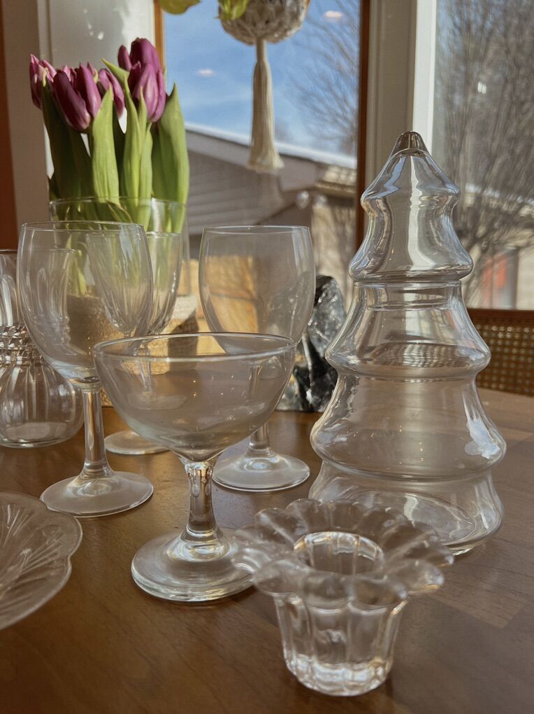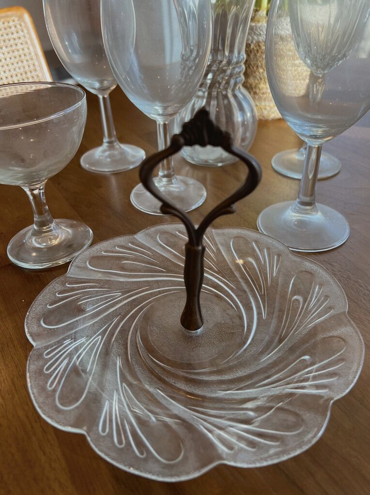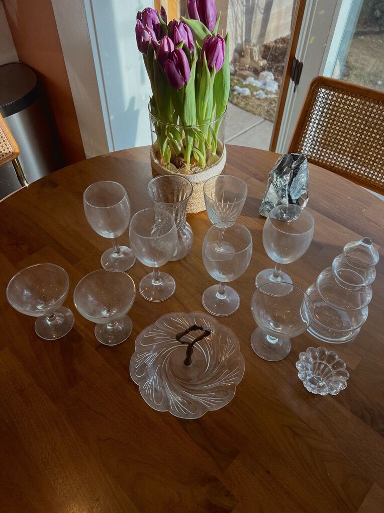 A cute lot of vintage entertaining glass! All in excellent shape, no chips or cracks. :) This bundle includes stemmed crystal wine glasses, champagne goblets, pressed glass serving tray & small decorative pieces including a christmas tree jar, glass vase and glass candle holder! Pickup in Midvale Utah! Venmo or cash!