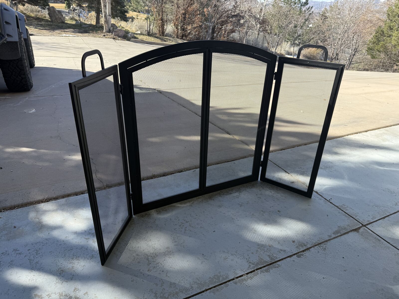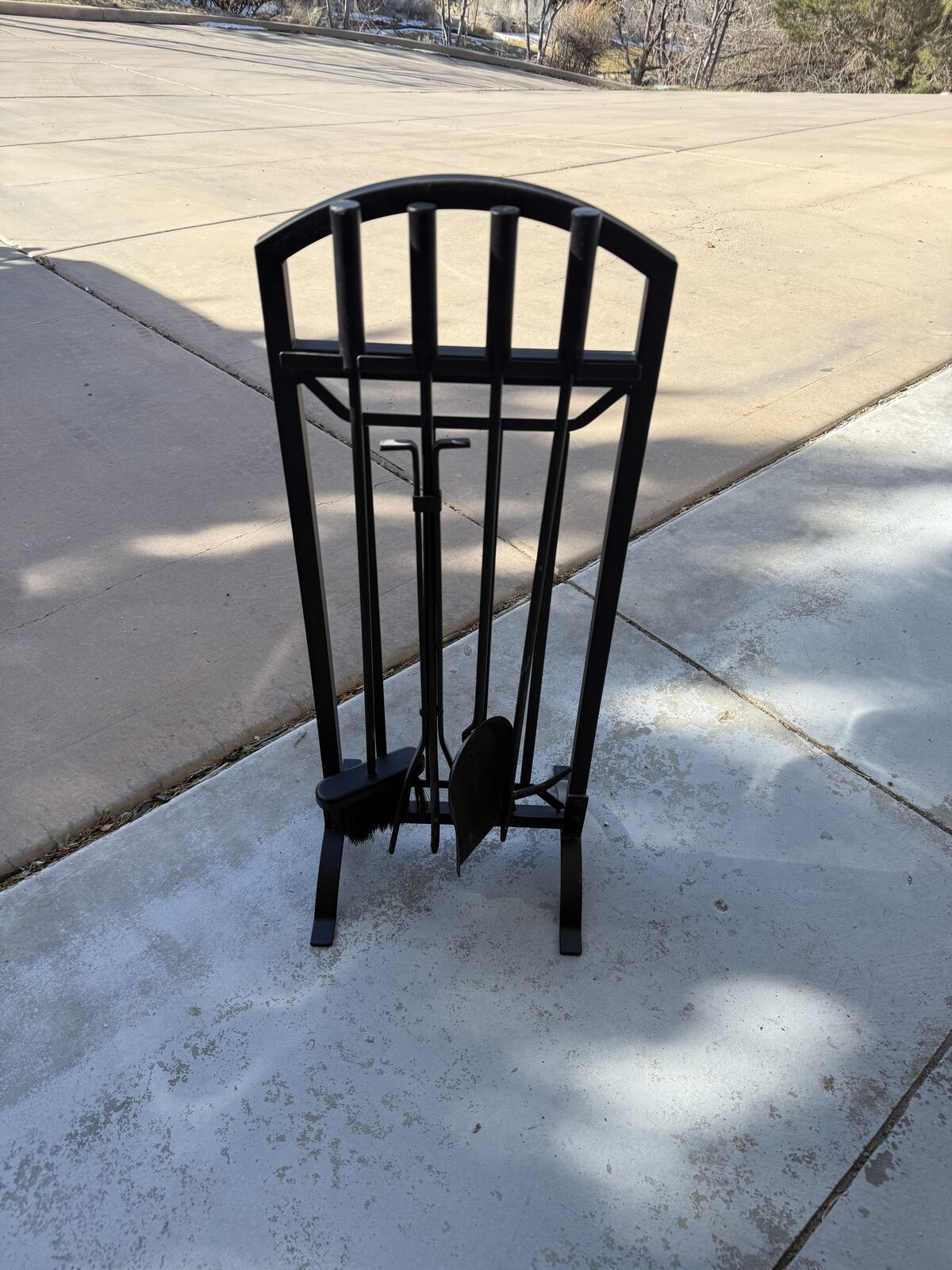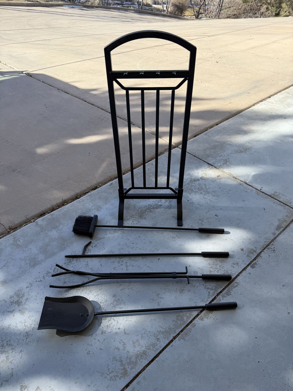 Selling fireplace screen, 4 tool set & stand and fireplace grate. Screen total width is 54.5" and center height is 32". Was purchased a while back for a wood fire insert but we decided on a pellet stove instead. Has been assembled but not been used.