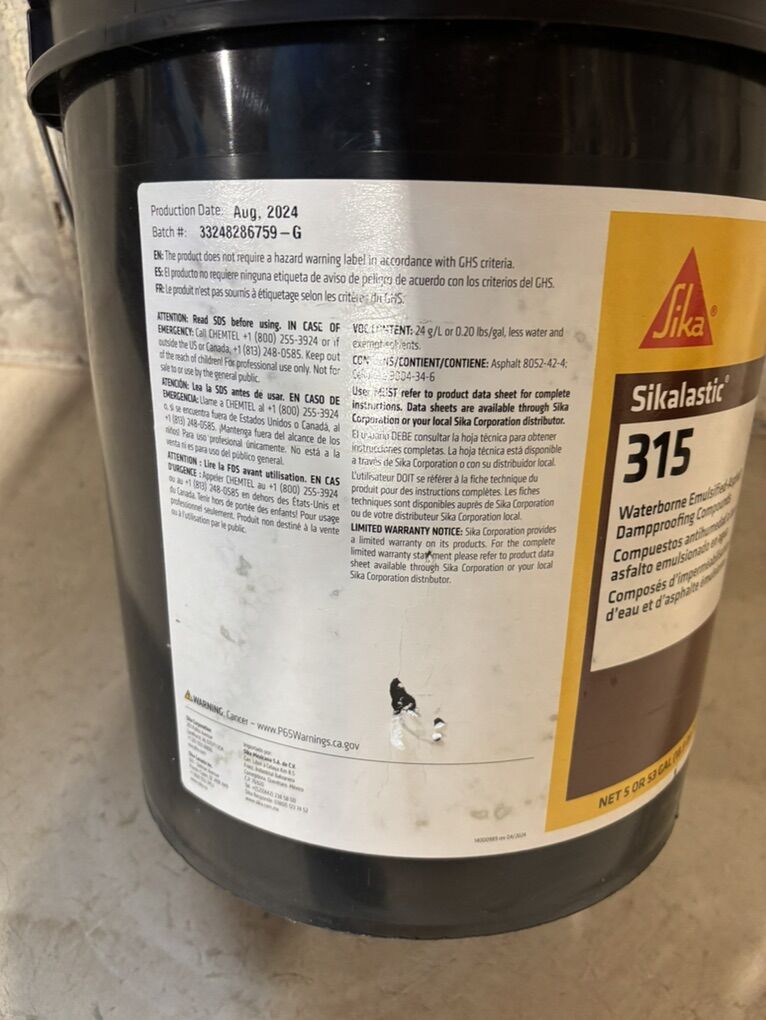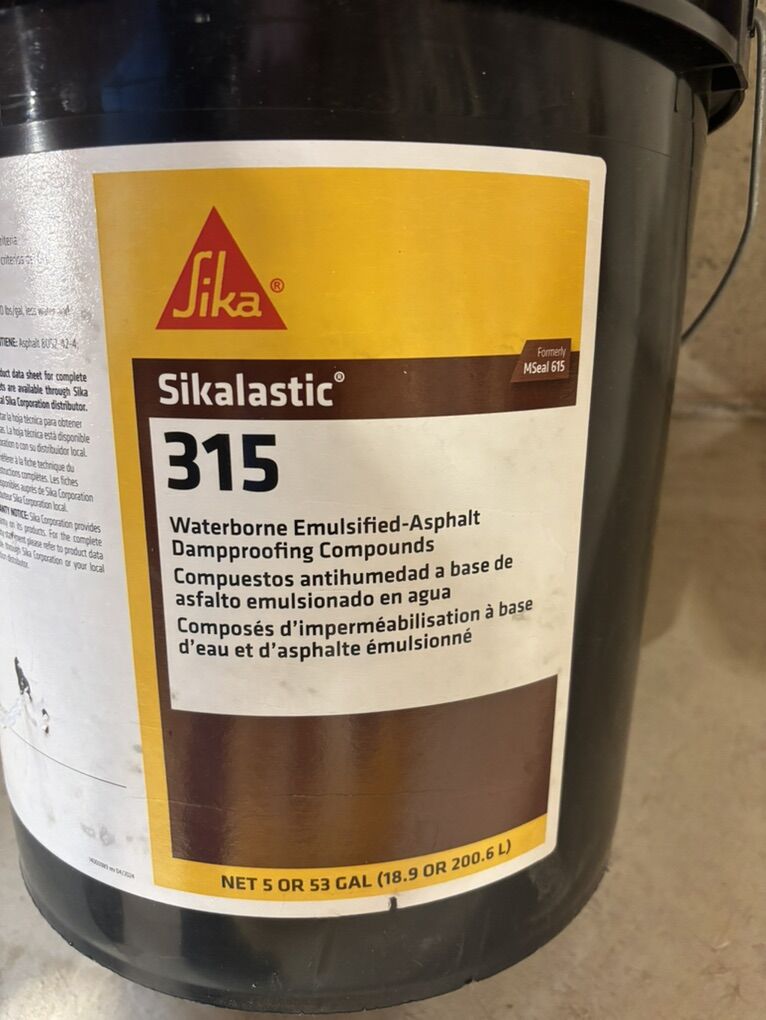 BRAND NEW unopened 5-gallon bucket of Sika Sikastic 315 (formerly MSeal 615) foundation waterborne emulsified asphalt damp proofing compounds.