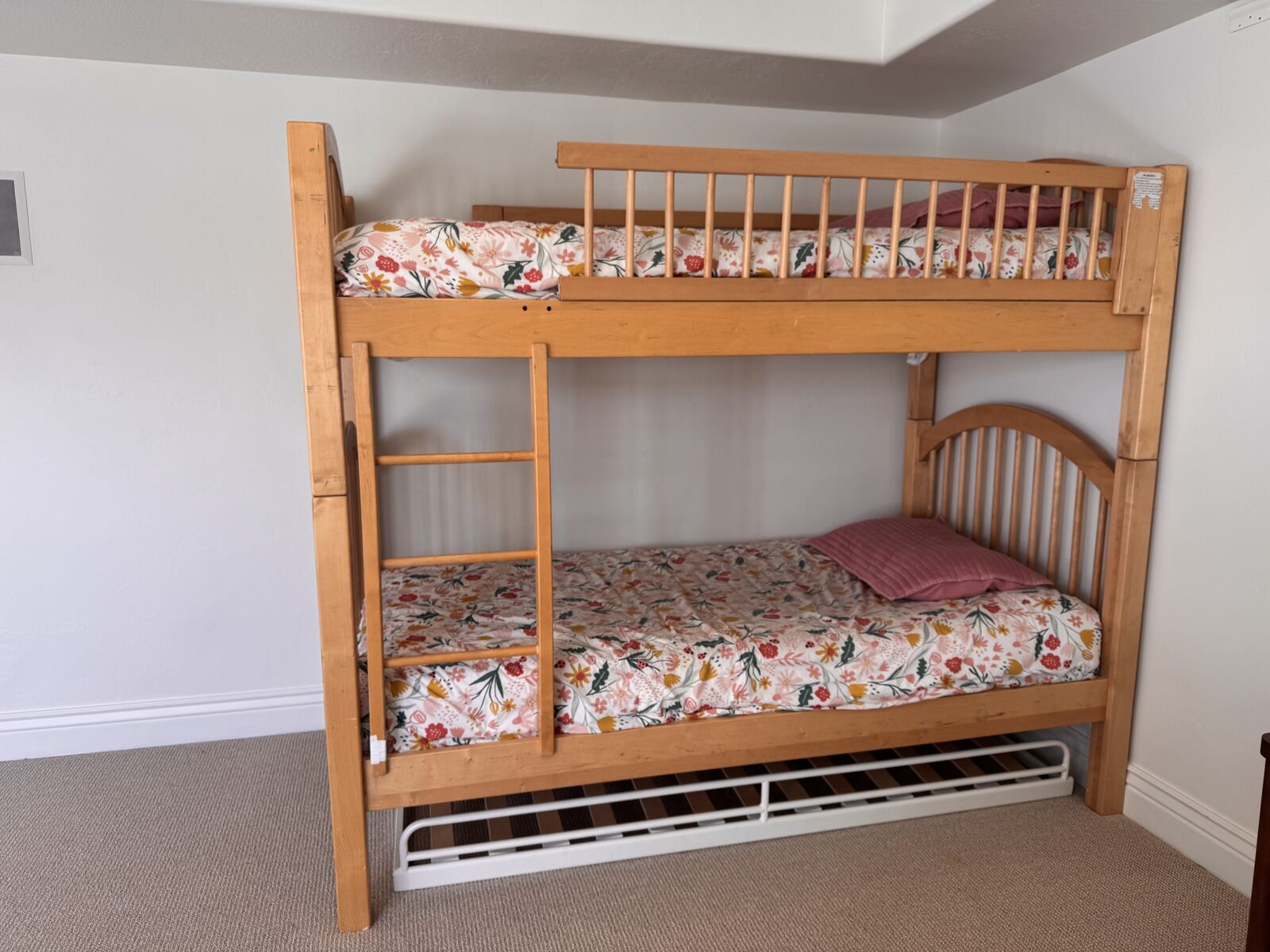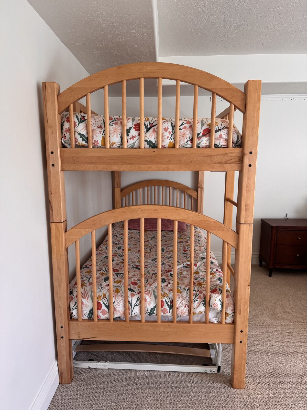Used wood bunk beds, can be reconfigured to two twin beds. There is some damage on one of the top rails and the bottom of the ladder. Must be able to pick up. It will be disassembled for pick up.