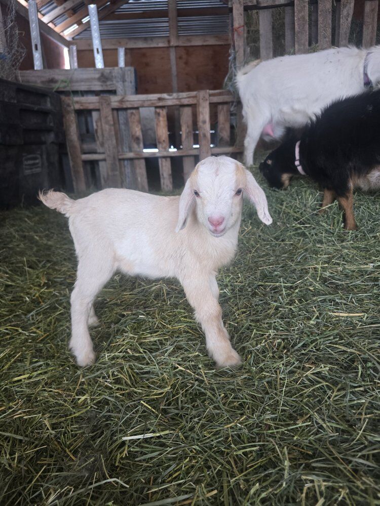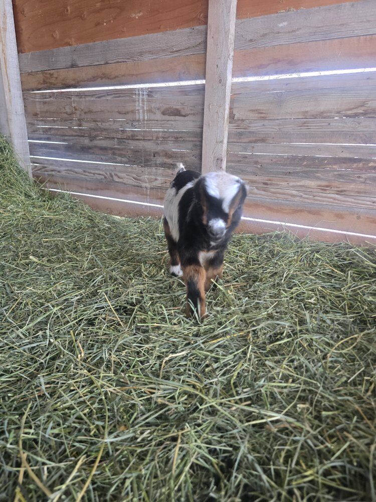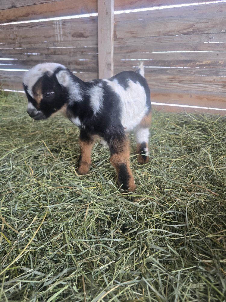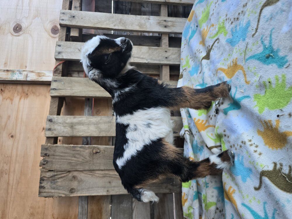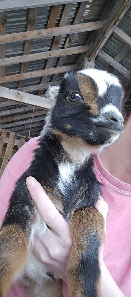 we have 2 cute male baby goats looking for loving homes can be bottle fed or wait till 10 weeks when weaned. dad is black and white nigerian dawrf moms are mini lamancha blue eye white blue eye tri idk how finn has floppy ears but he adorable! he the white and tan boy ! milo the black tri he got little numb ears lol both handsome and good looking bucks ! they would make good breeders or loving pets ! they been handled by kids alot ! milo tri bday is feb 16, 2026 finn white/ tan bday is feb 20, 2026 100 each