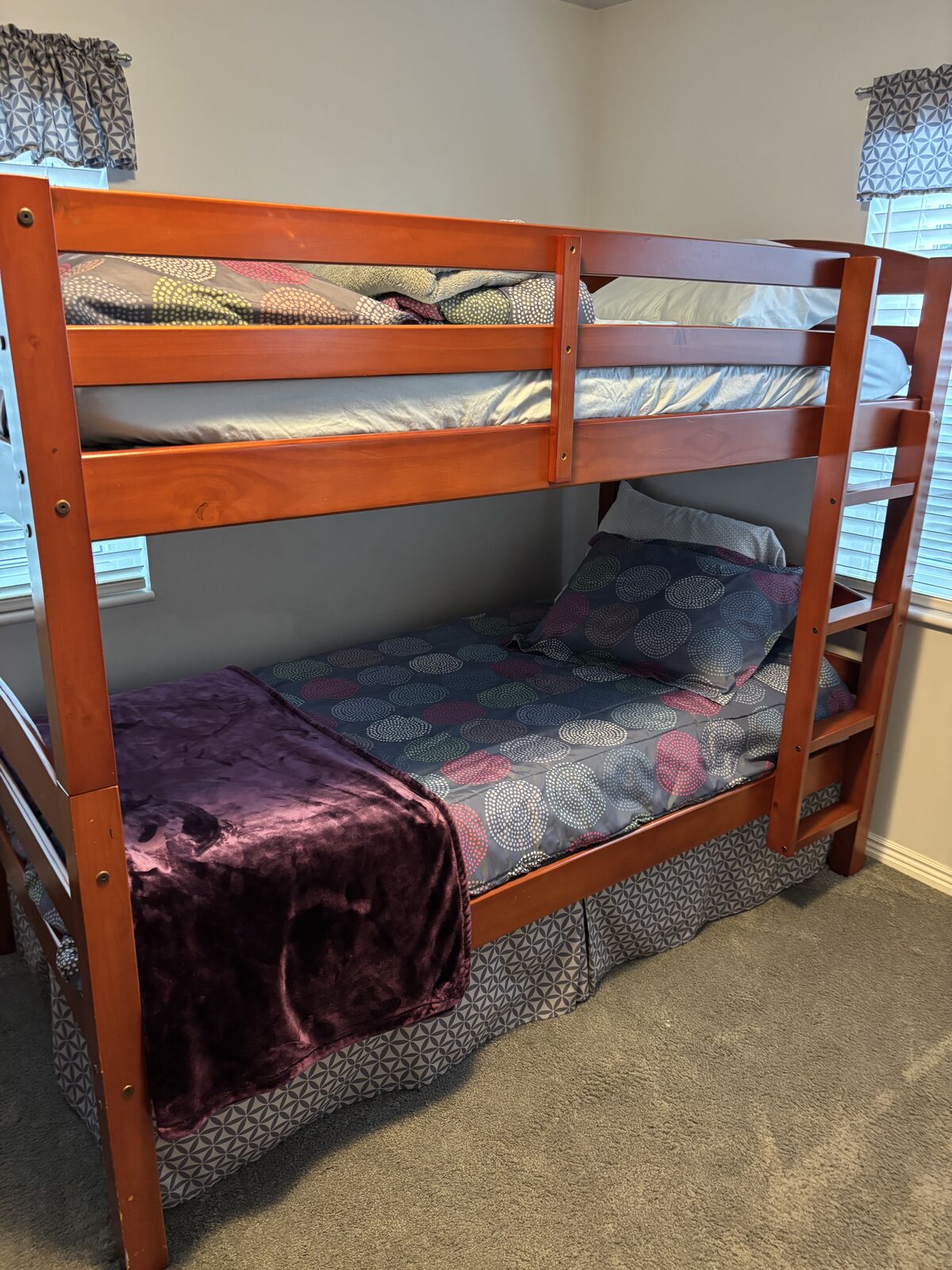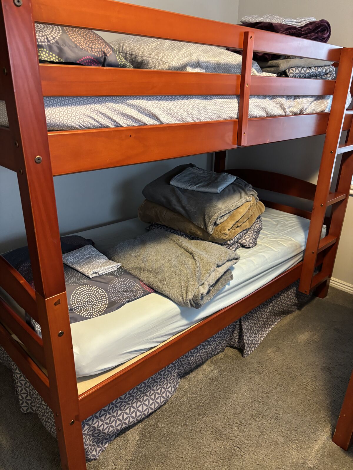 Two complete twin over twin solid wood bunk bed sets with ladders (four twin beds). Each set includes two memory foam mattresses (box springs not required), two sets of sheets, two blankets, two comforters, two pillow shams. One set $200; both sets $350. Cash only transaction. Requires on-site disassembly.