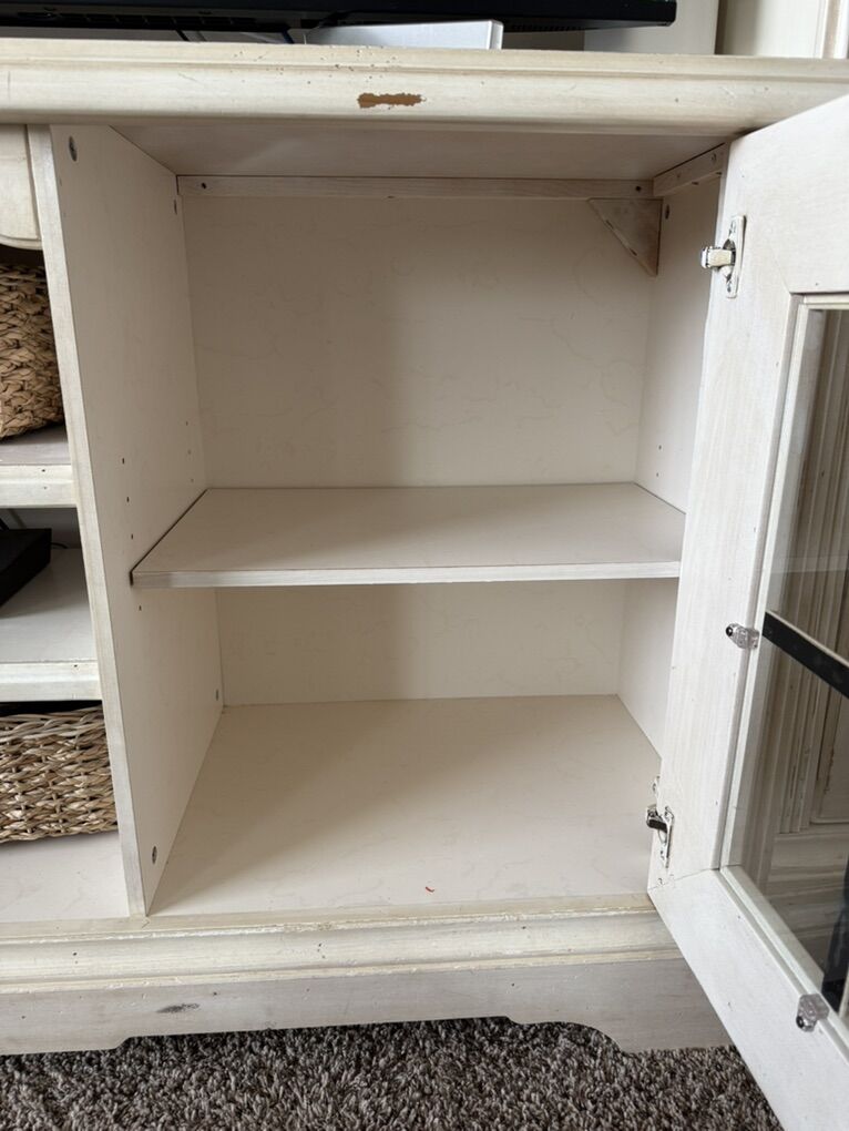 VenmoThis beautiful farmhouse entertainment center is an off white cream-ish color and made to look antiqued/ rustic. Each cupboard part of it has a shelf and together as a whole it has lots of storage for books, dvd’s, games, decor, ect. The entertainment center is very sturdy and heavy. It does come apart it sections making it easier to move and transport.