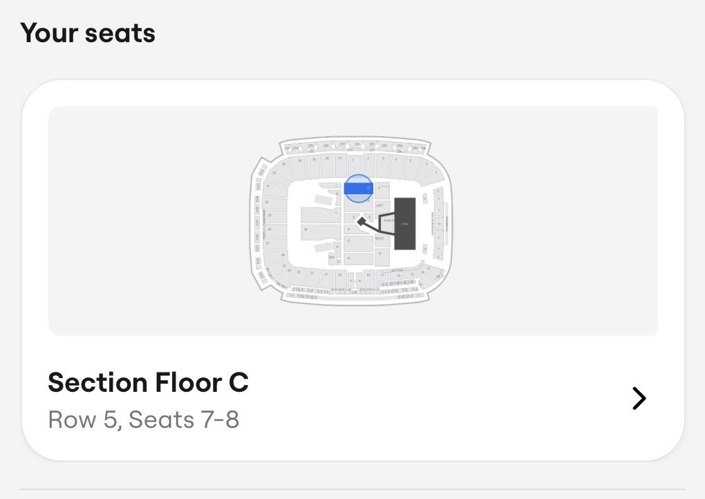 $500 each ticket. Seats are located on Section Floor C Row 5, Seats 7-8.
