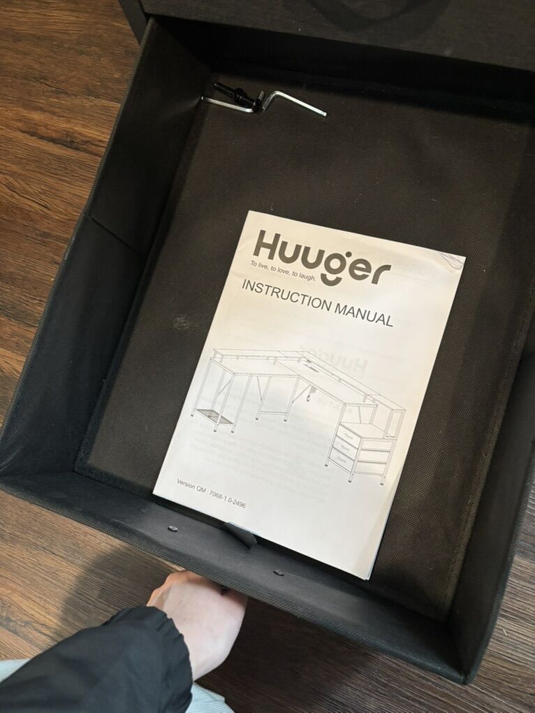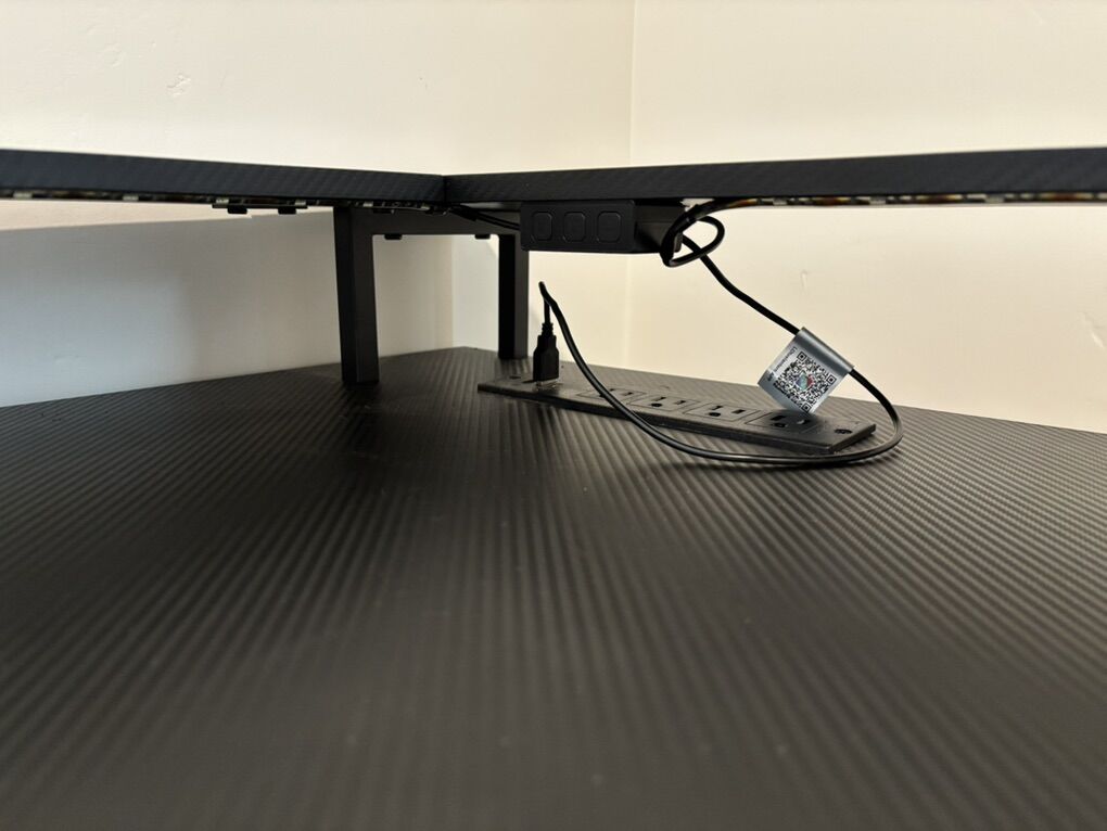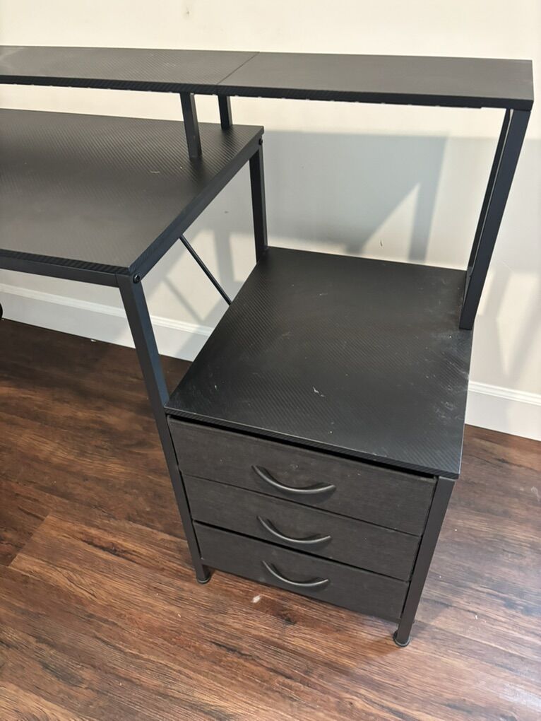 Spacious L-shaped desk (59.1” x 55.1”) with RGB LED lights, built-in power strip (4 outlets + 2 USB), monitor riser, 3-drawer cabinet, and PC shelf. Reversible, sturdy steel frame. Gently used, minor scratches.