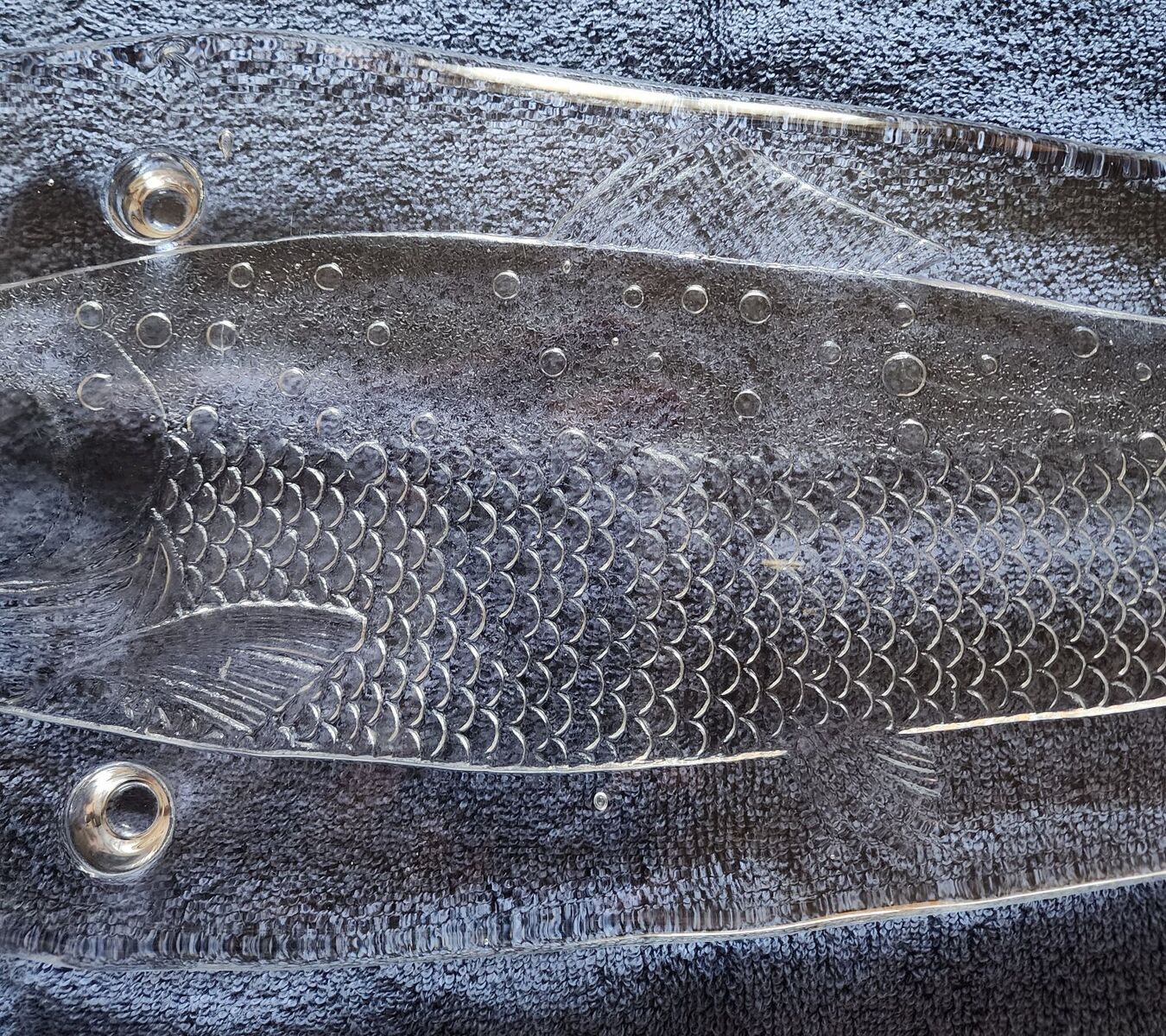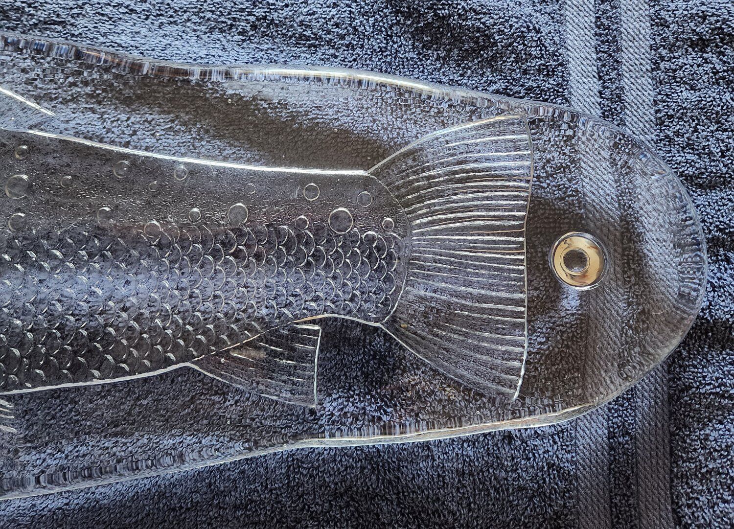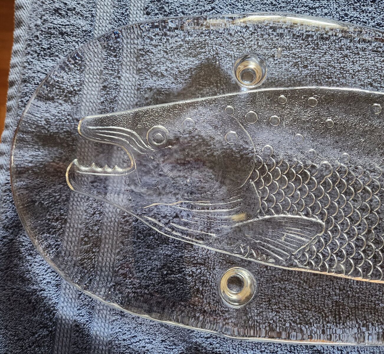 Italglass 3 dimensional detailed fish pattern in thick glass with 3 integrated feet. Has some blemishes, bubbles, but no chips. Top is smooth. For entertaining or display. 22" long, 8" at widest point, about 7 lbs.