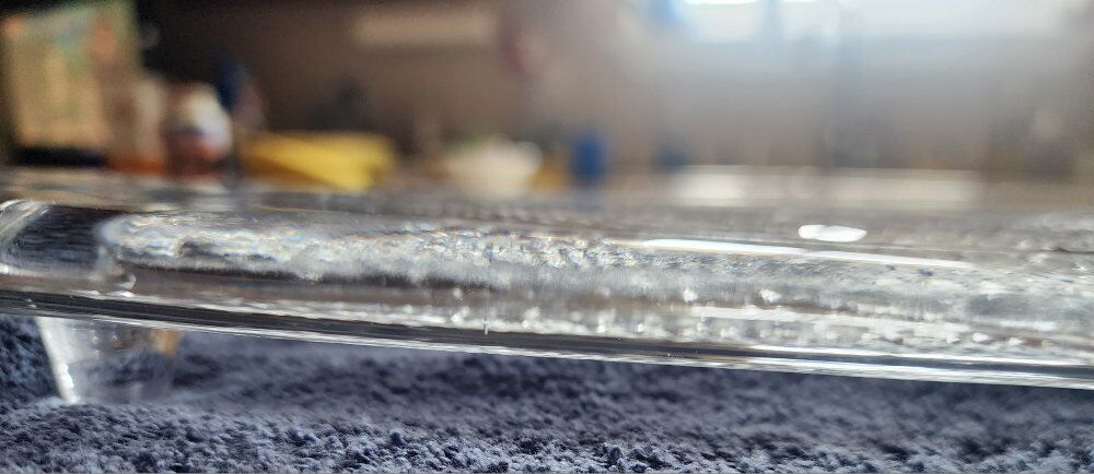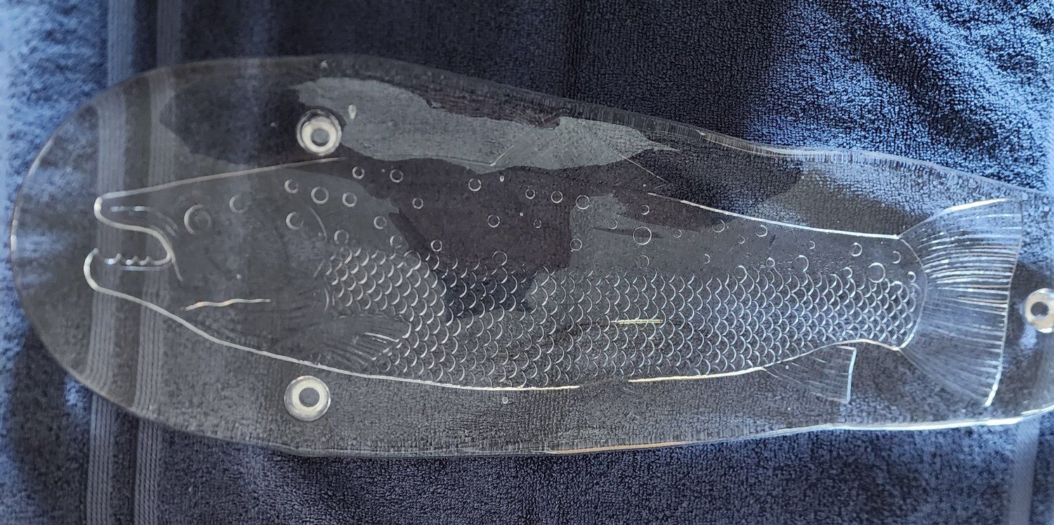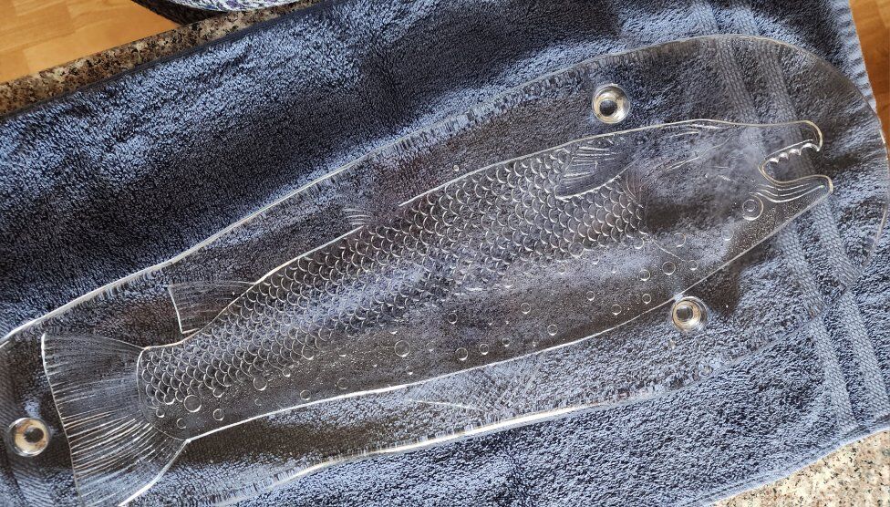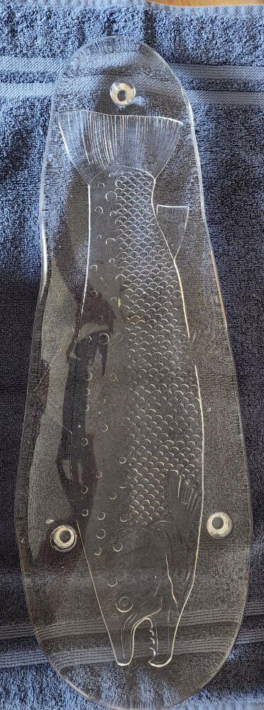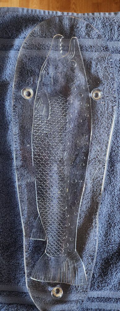 Italglass 3 dimensional detailed fish pattern in thick glass with 3 integrated feet. Has some blemishes, bubbles, but no chips. Top is smooth. For entertaining or display. 22" long, 8" at widest point, about 7 lbs.