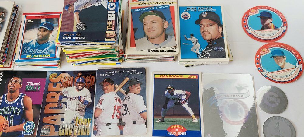 Baseball card lot of approx. 450 cards most from the 1990's including a Mike Piazza auto- sign card, a Tim Salmon & Mike Piazza sealed card out of cereal, Willie Stargell 1992 Kelloggs all star reflective card, a 1987 reflective card & a couple stickers. Please text or message me with any questions, thanks