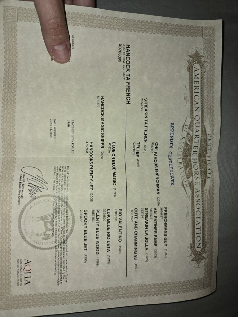 CashAppMeet Bryer, she's an AQHA Appendix certificate from what I see and have heard. She's got some awesome bloodlines. She'll be 2 years old in June and ready to take in any direction. She's pretty easy to catch and loves treats. She picks up her feet, loads in the trailer, and ties. I've been putting a saddle on her and working her with it on, and she's been doing good, letting me throw it right on. I have more pictures and videos, text for more questions. 4k OBO