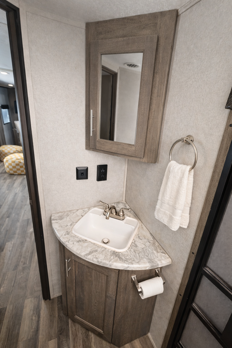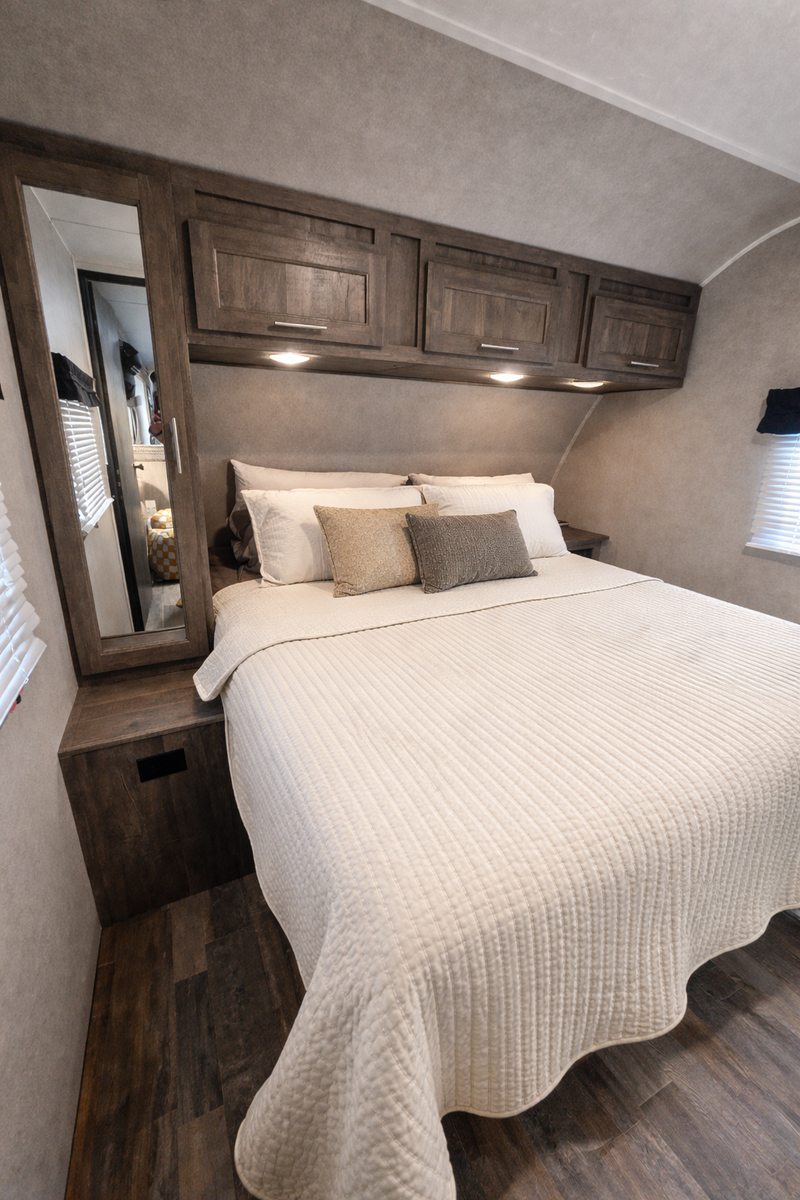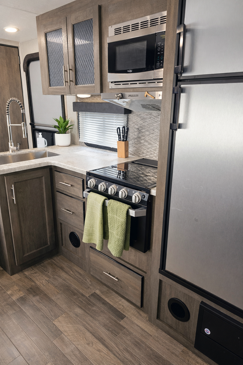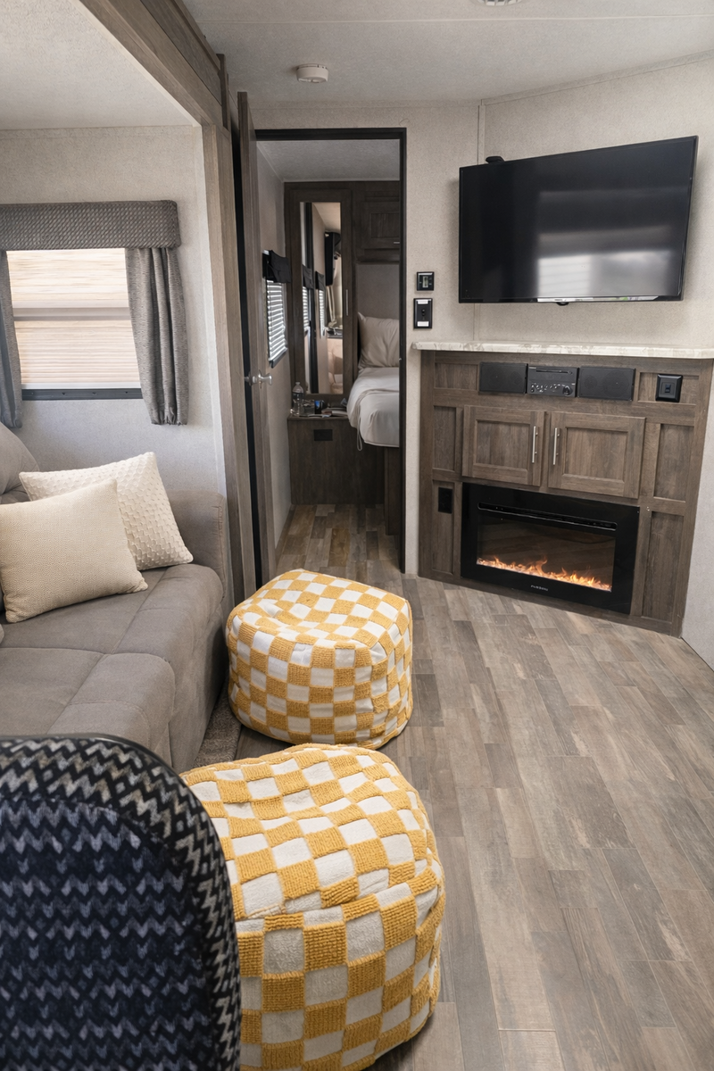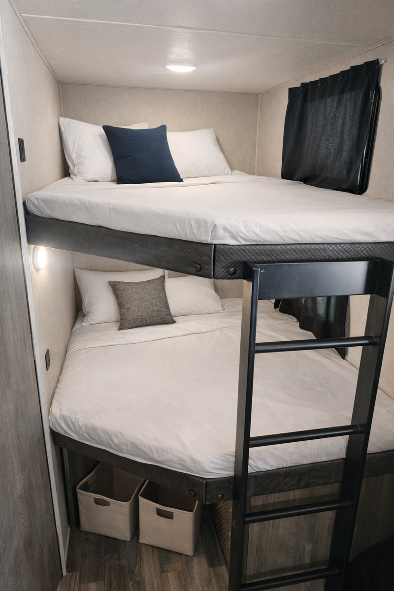 Specs: 33 ft length 6,640 lb UVW Family-friendly bunkhouse Sleeps comfortably with dedicated bunks Spacious slide-out living area Electric fireplace + entertainment center Large refrigerator, 3-burner range, oven & microwave Plenty of interior and exterior storage