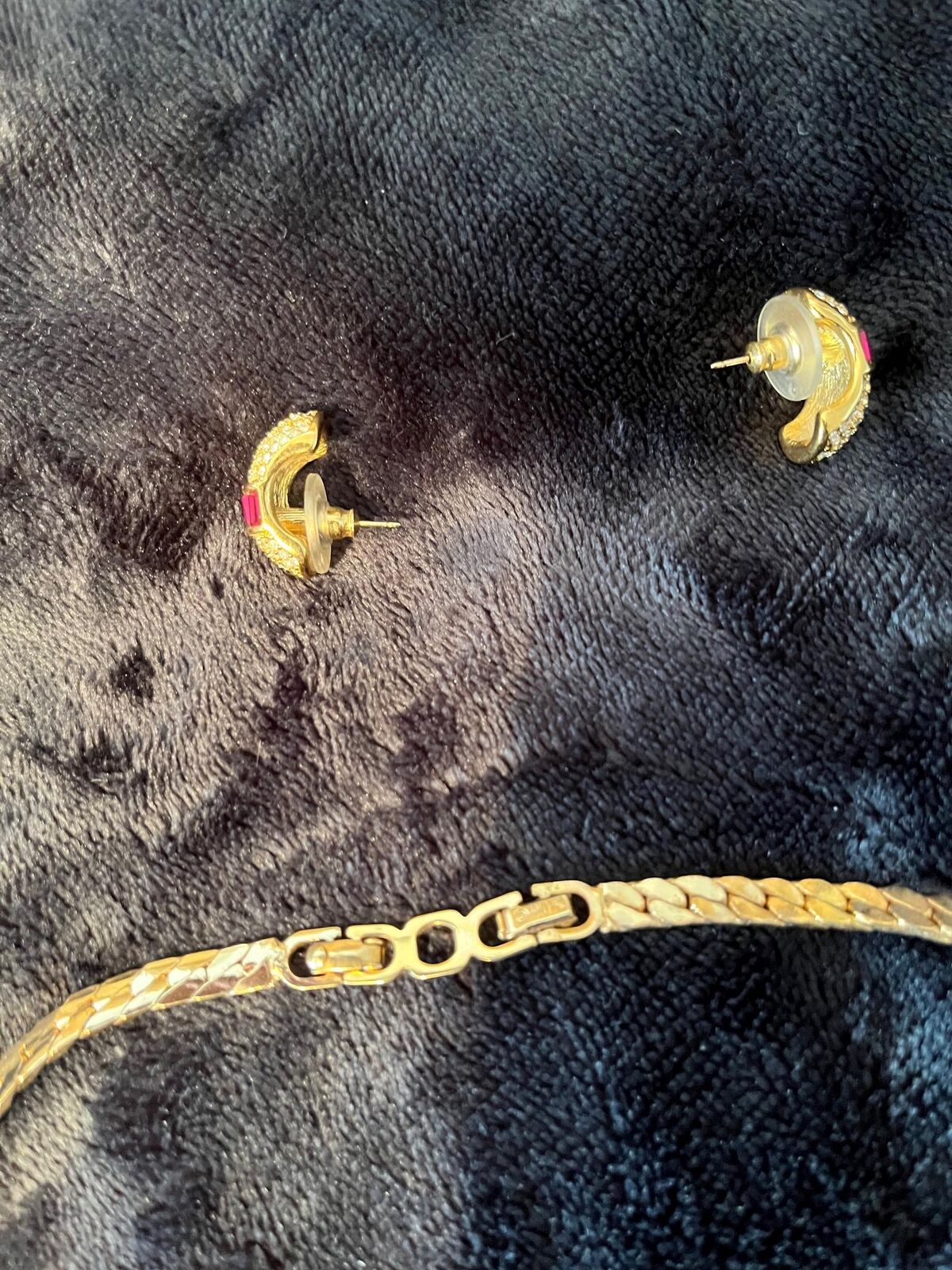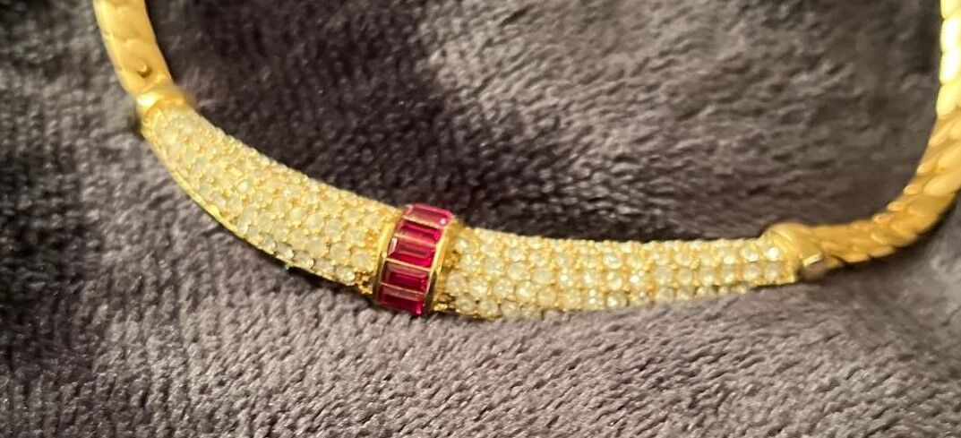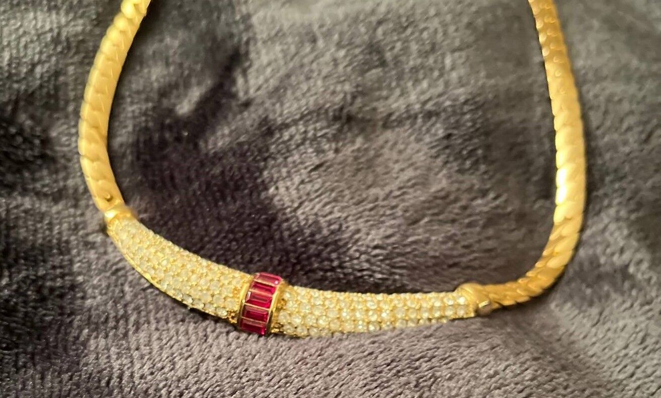 VenmoThis is a never-worn mesh choker necklace and matching pierced-ear earrings from Christian Dior. Heavily encrusted (paveed) with Rhinestones and faux Rubies. 18kt gold plated. These are stunning pieces.