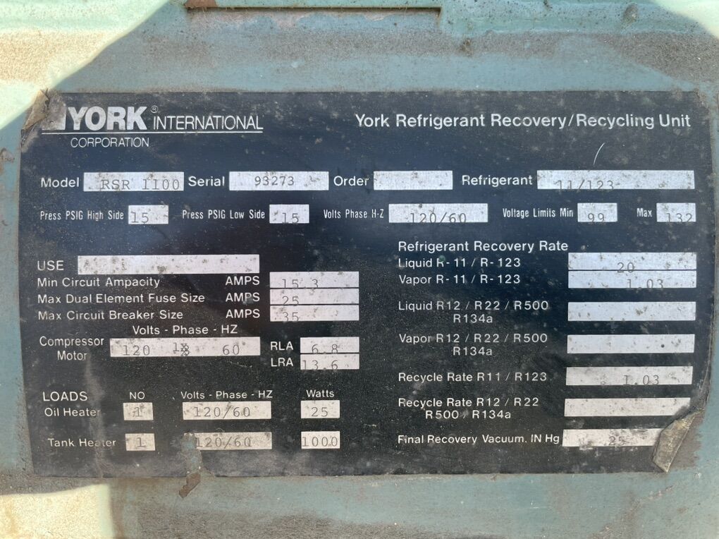 York, Johnson Controls medium low pressure recovery machine. Motor compressor heaters have been verified operational. 1100 pound capacity very easy to transport.