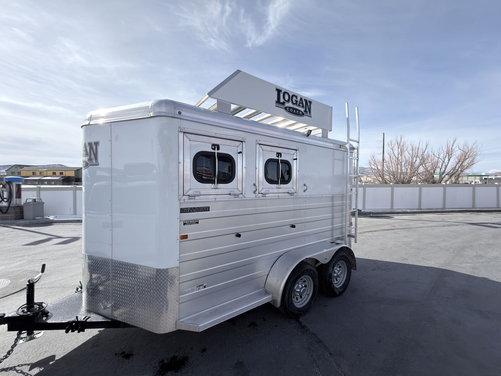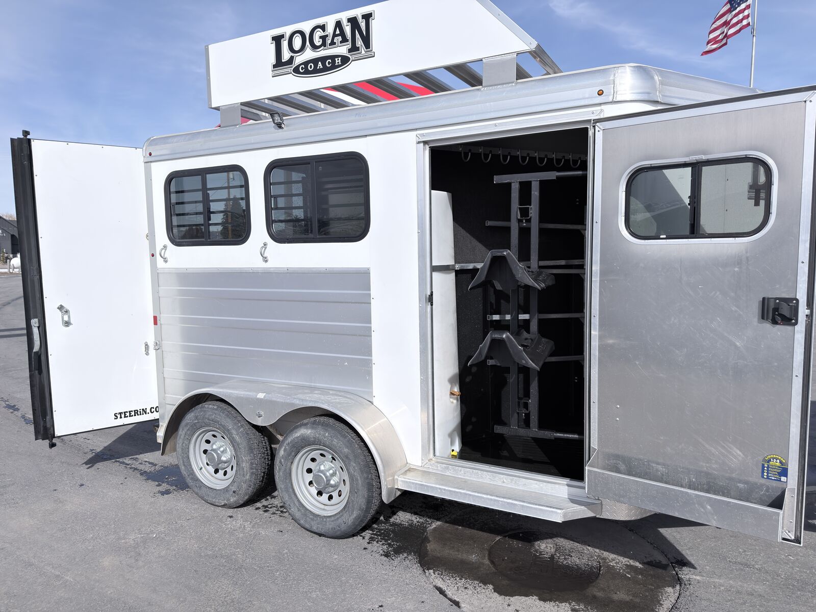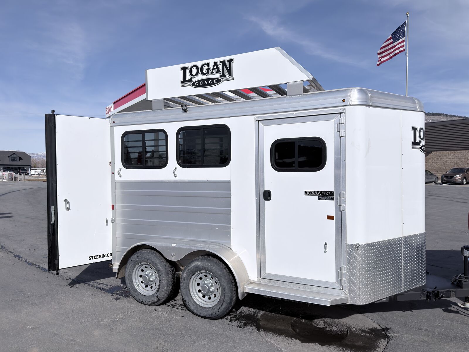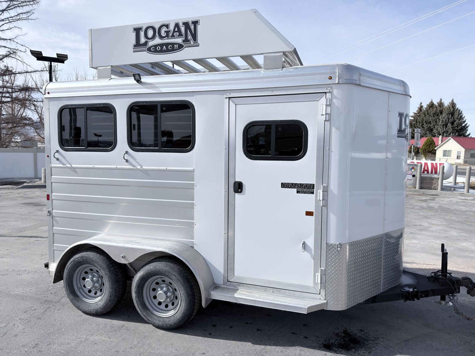 Venmo2022 Logan 2 horse White Bullseye 2H BP white trailer. This trailer measures 6’9" wide x 7’ tall x 13' box and features a 2 5/16" ball, diamond plate gravel guard, front tack has a swing out saddle tree, bridle hooks, blanket tree, brush tray and a spare tire. The horse area is equipped with padded stalls, roof vents, double lined with vortex lining on all walls, big bus windows on butt side, fully framed drop down windows with safety bars and Logan screens, 3 LED load lights, aluminum skin and polished sides, double back doors, and a rubber rear bumper, 3,500# Dexter torsion axles. 15"6-lug steel wheels. Tear drop fenders, w/ traditional class running boards. Manual crank top wind jack. 28 gallon triangular upright corner water tank. Wood floors with removable rubber floor mats. Vortex double lined kick wall in stall area. Oval tube aluminum telescoping shoulder divder. Pop up vents, one per stall. Tie rings, one per stall each side. Standard light package w/ 3 flood lights on Outside. 6' roof rack 6'9" wide.
