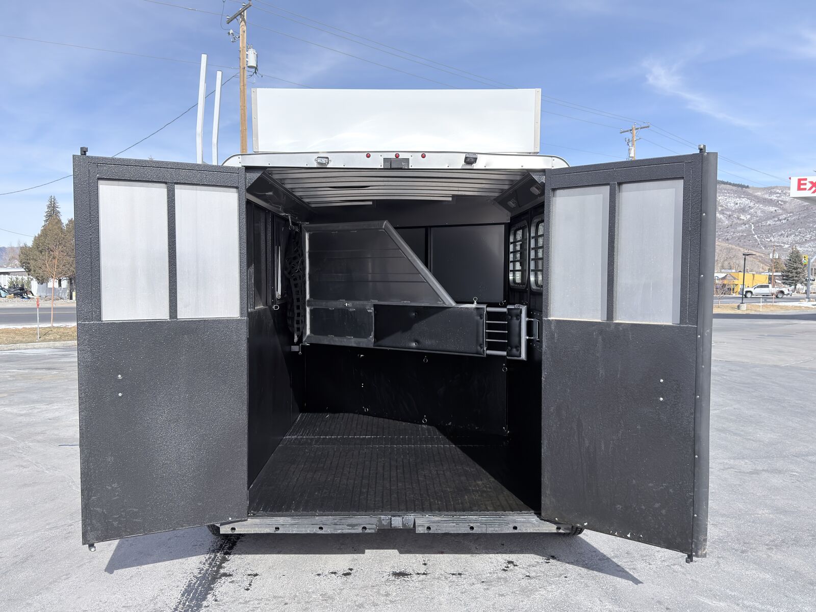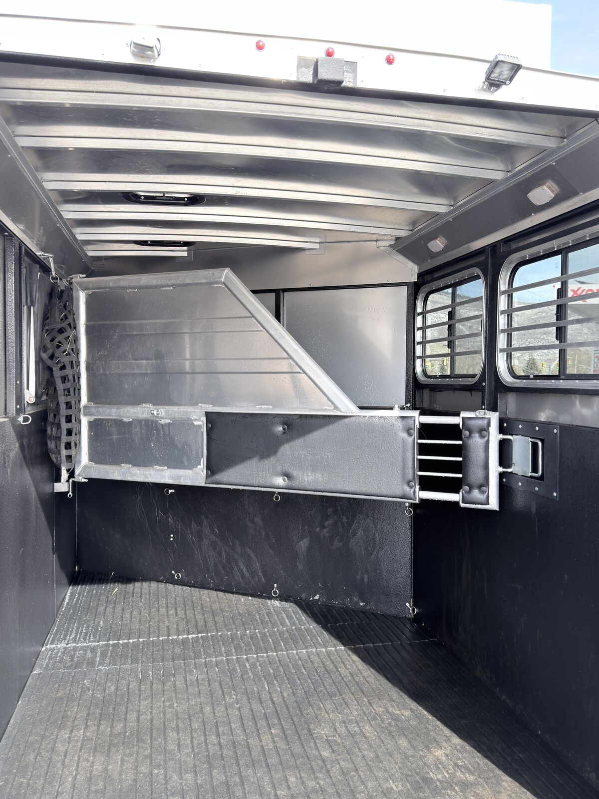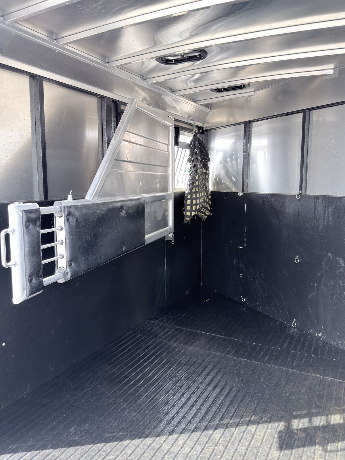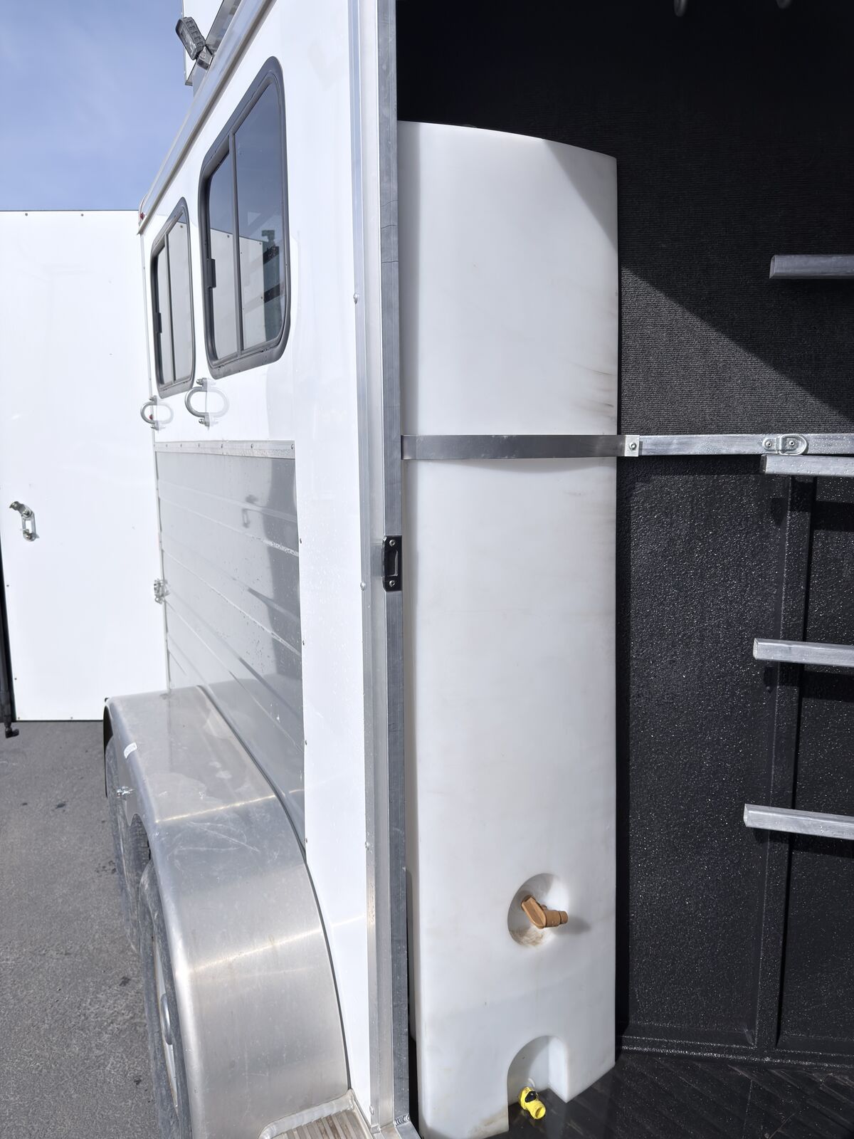 Venmo2022 Logan 2 horse White Bullseye 2H BP white trailer. This trailer measures 6’9" wide x 7’ tall x 13' box and features a 2 5/16" ball, diamond plate gravel guard, front tack has a swing out saddle tree, bridle hooks, blanket tree, brush tray and a spare tire. The horse area is equipped with padded stalls, roof vents, double lined with vortex lining on all walls, big bus windows on butt side, fully framed drop down windows with safety bars and Logan screens, 3 LED load lights, aluminum skin and polished sides, double back doors, and a rubber rear bumper, 3,500# Dexter torsion axles. 15"6-lug steel wheels. Tear drop fenders, w/ traditional class running boards. Manual crank top wind jack. 28 gallon triangular upright corner water tank. Wood floors with removable rubber floor mats. Vortex double lined kick wall in stall area. Oval tube aluminum telescoping shoulder divder. Pop up vents, one per stall. Tie rings, one per stall each side. Standard light package w/ 3 flood lights on Outside. 6' roof rack 6'9" wide.