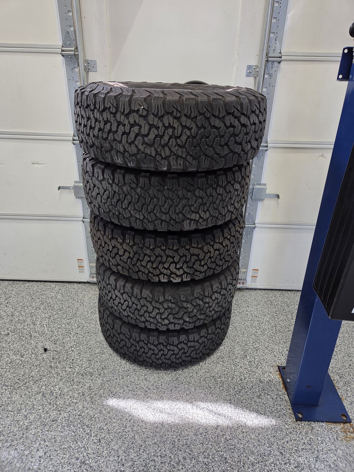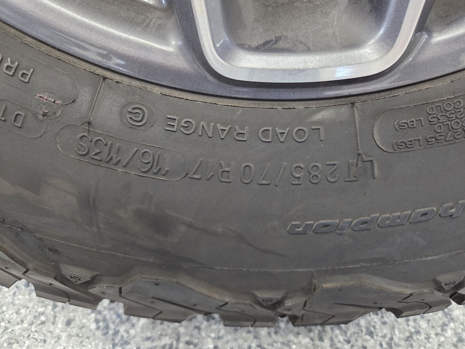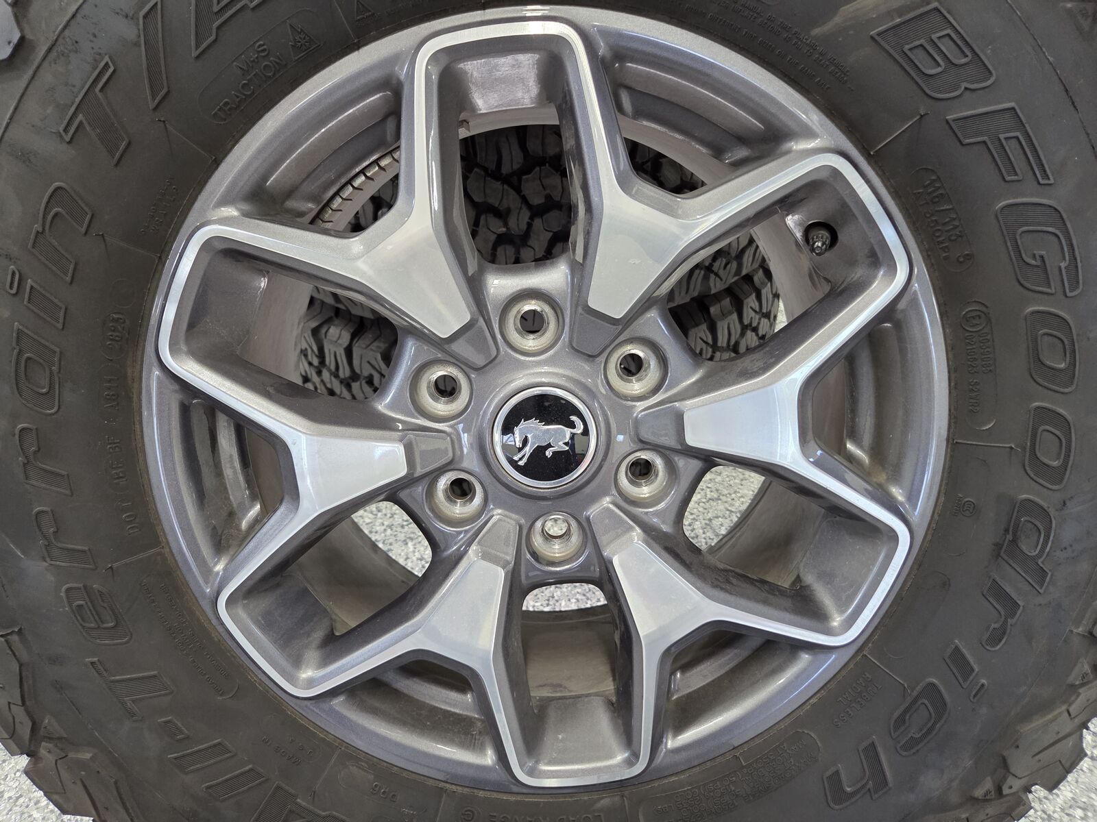 BF Goodrich KO2 tires. Size 285/70R17. Only 11,000 miles on four of the tires and zero miles on one. Ford Bronco 17X8.0 wheels with 55 offset. Five tires and wheels.
