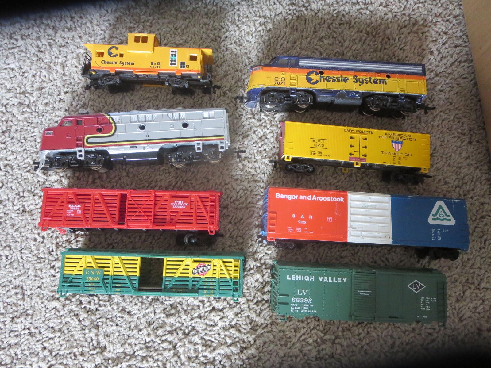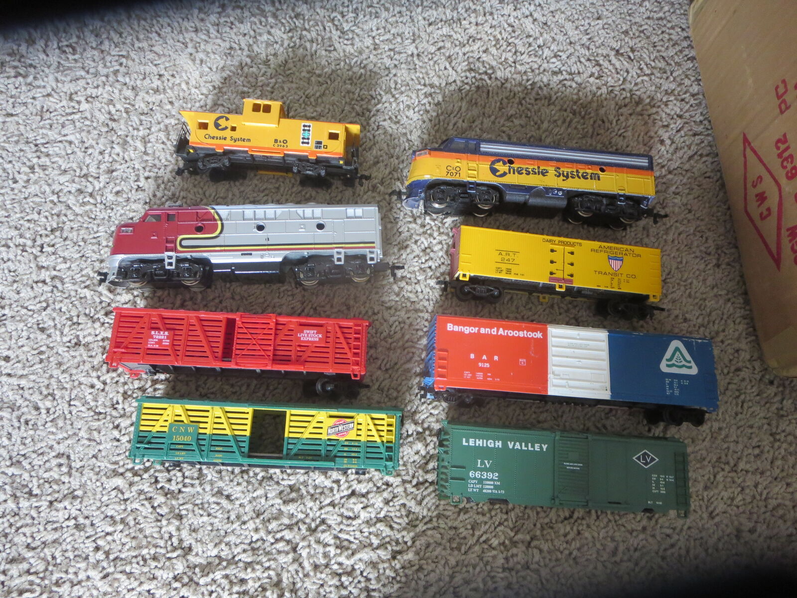 I have a. Vintage HO train set not tested yes some of the wheels are missing the 2 localmotives complete for sale call or text only thanks for looking D.
