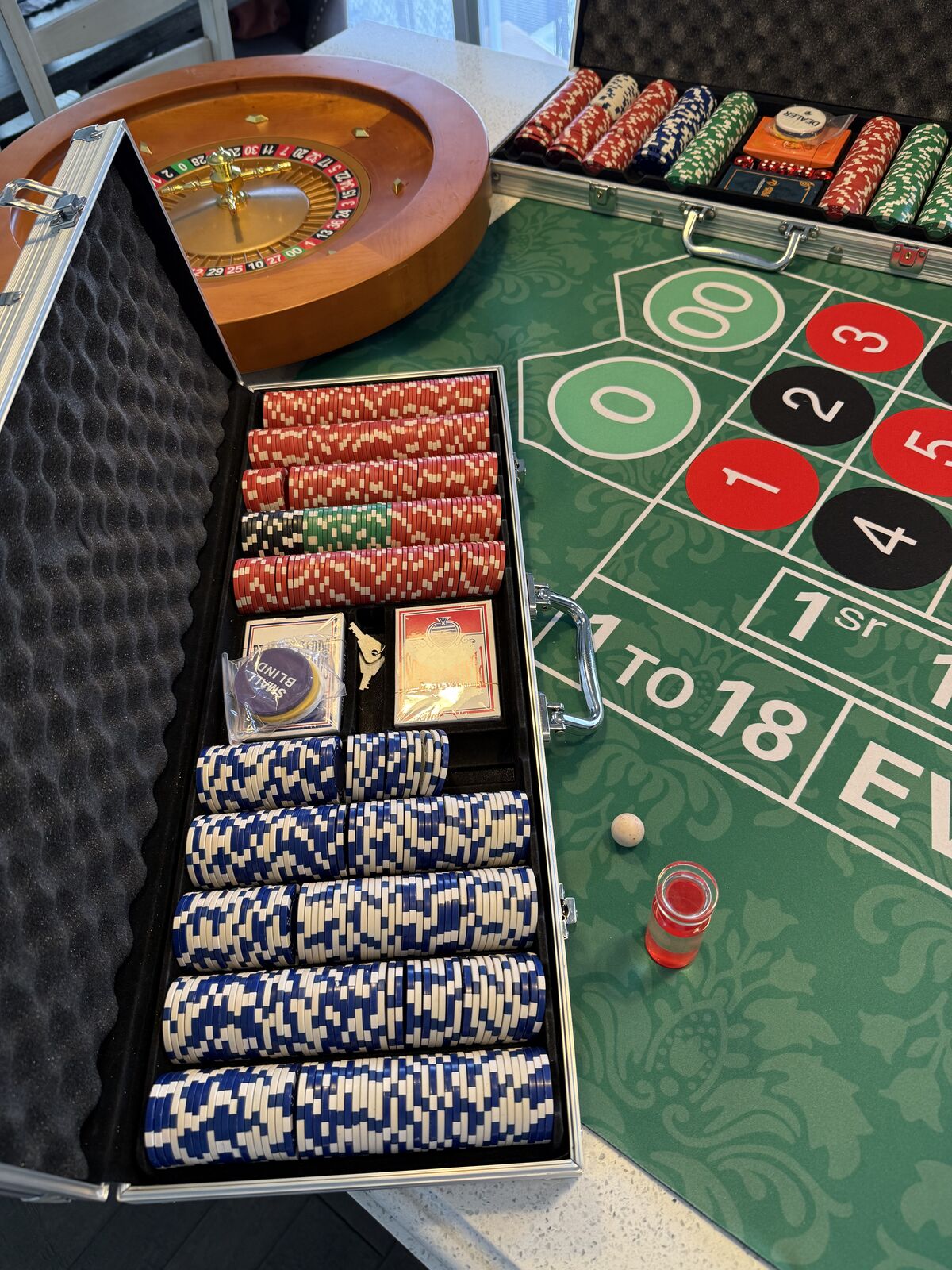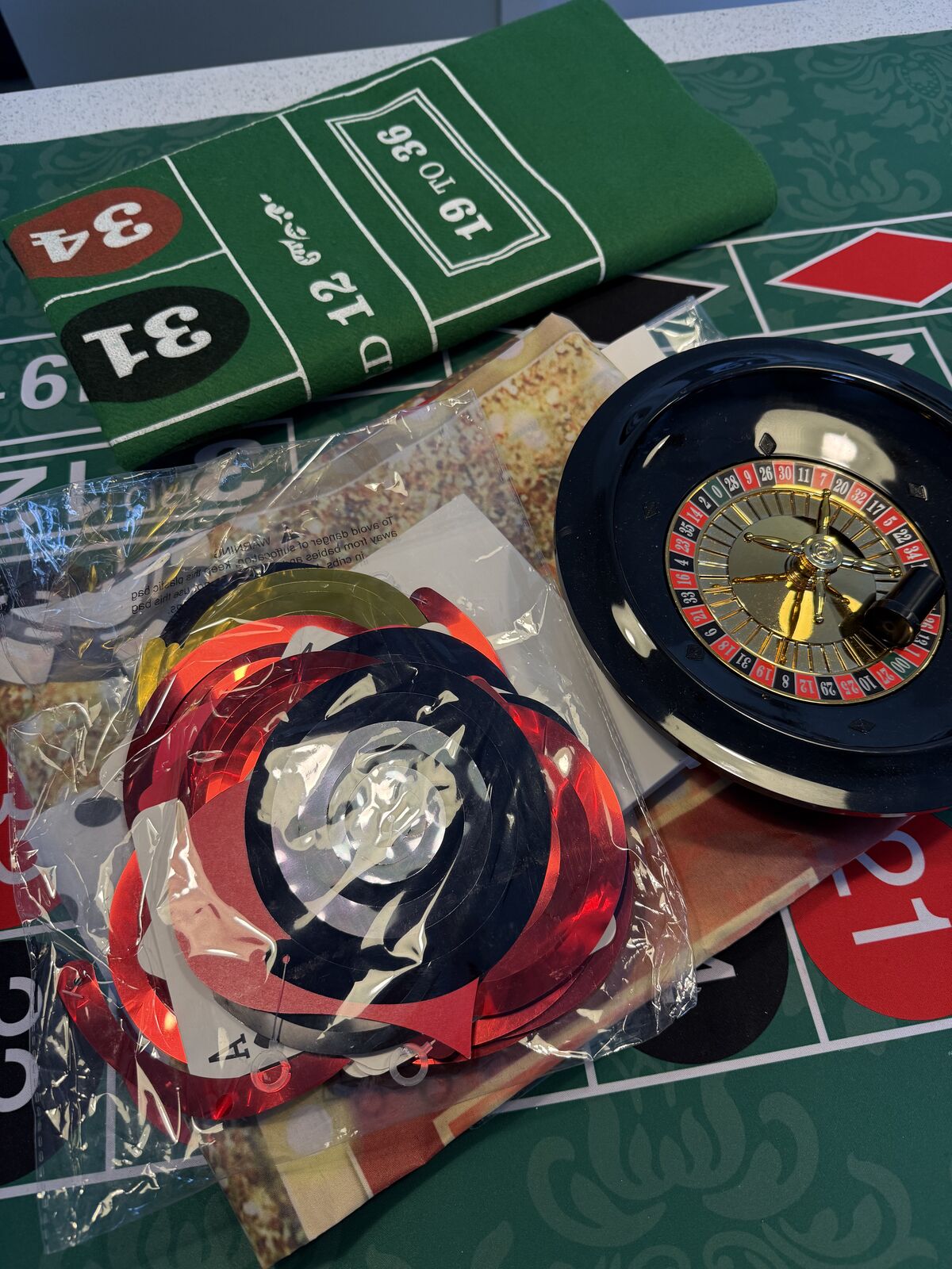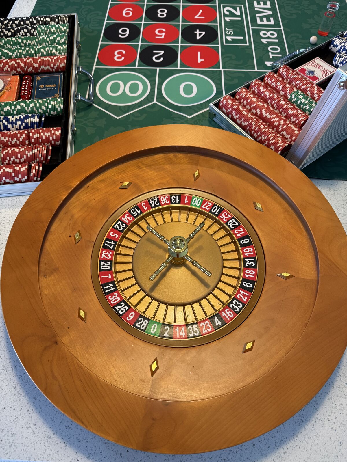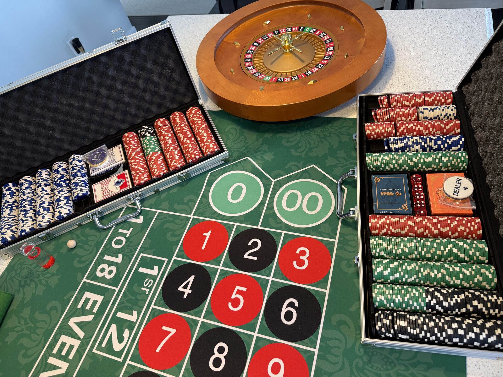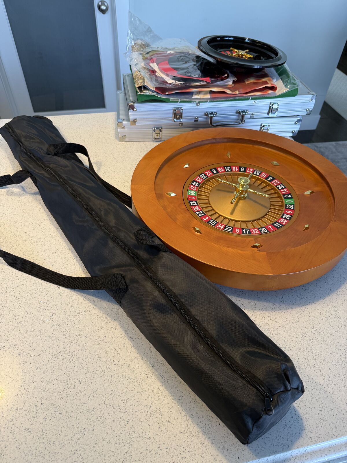 ZelleCasino night fun!!! 20” wooden roulette wheel (used, great condition), number marker, ball, roll-up rubber mat w/ bag and 2 sets of clay chips. Also includes a felt mat with one side roulette and the other side black jack, and some unused casino party decor. Everything was originally purchased on Amazon for approx $450 and used personally at home for game nights, but no longer needed