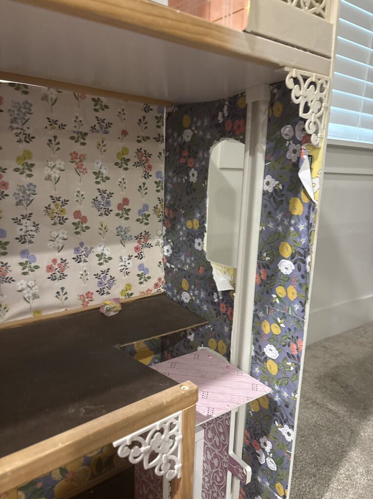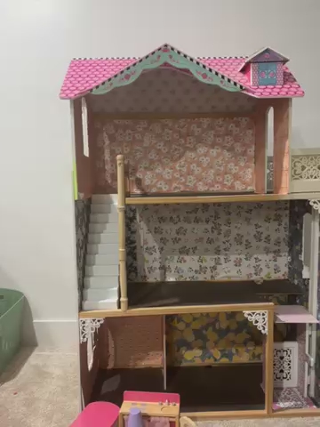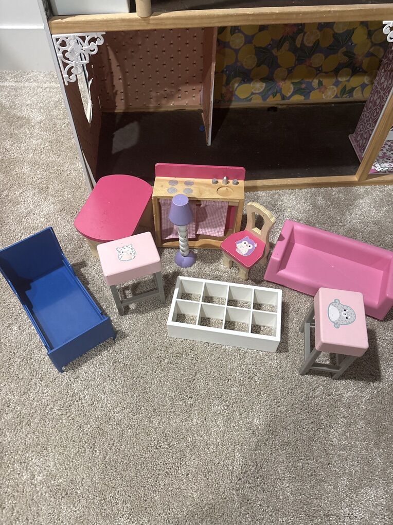 Free extra large dollhouse, with assorted furniture. This dollhouse has been well loved. It was an art project for my daughter- some of the paper is peeling back from the walls. In great working condition, could be a fun project piece! Comes from a pet free and smoke free home.