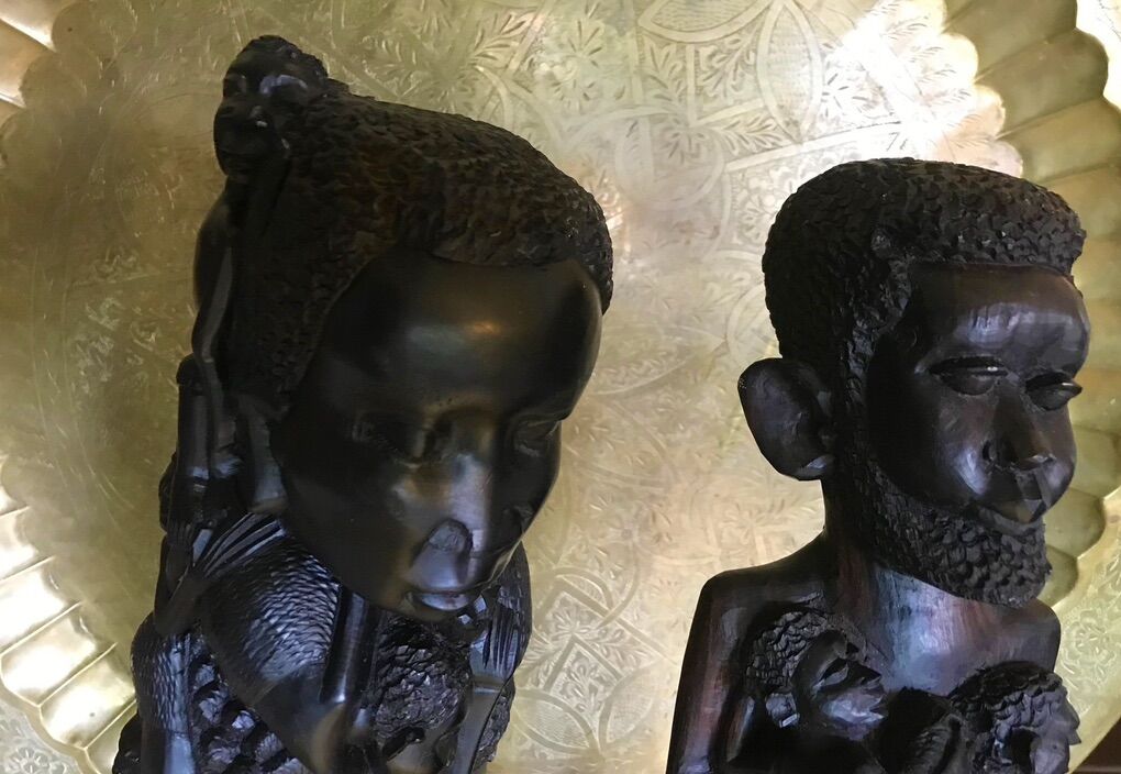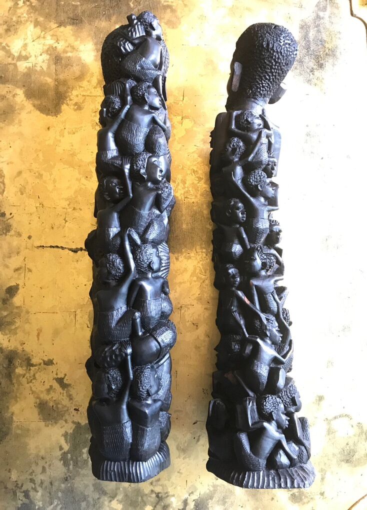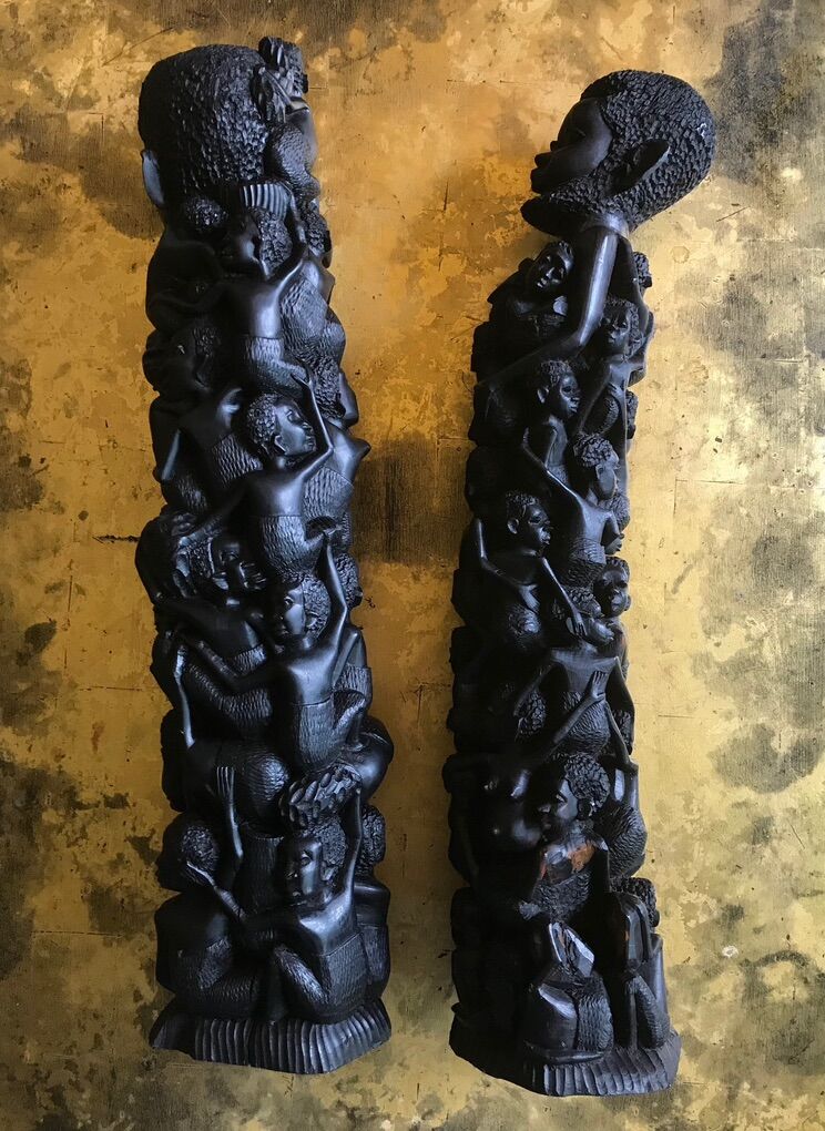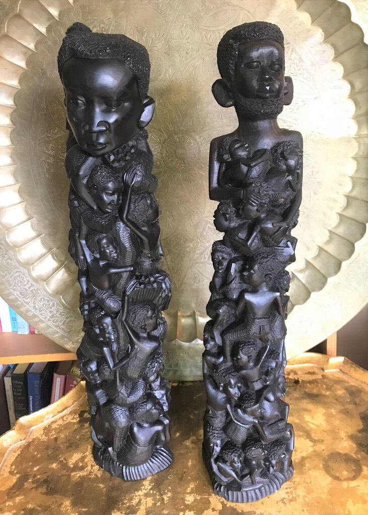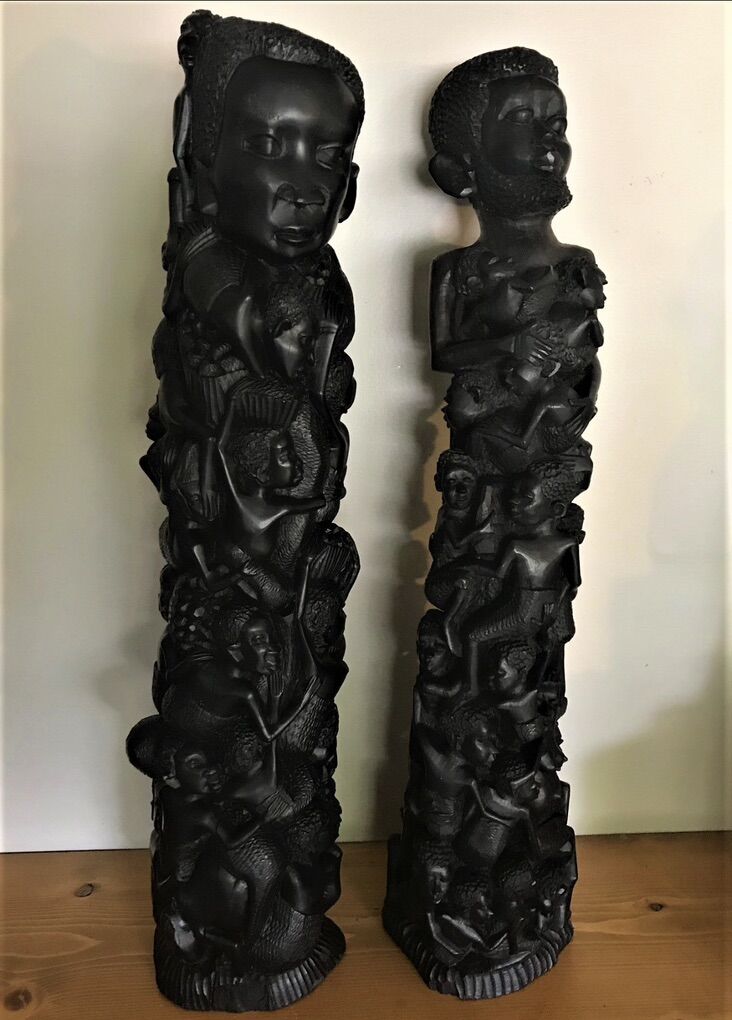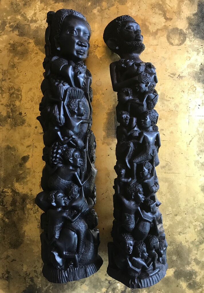 VenmoEBONY MALE AND FEMALE MAKONDE TREE OF LIFE STATUES 24+ TALL This pair of beautiful vintage Family Tree of Life statutes, both male and female in theme, were hand carved from ebony by members of the Makonde people. They were purchased by a life long friend who was a merchant marine engineer during one of his many trips to Africa and beyond. I know he made several floats to Diego Garcia in the middle of the Indian Ocean, as well as trips to Nigeria during the Biafran Civil War.