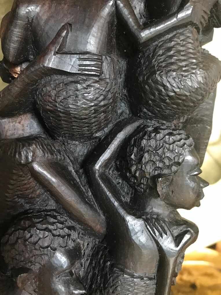 CONDITION: some age cracks; the only wood deterioration was original to the piece and was accomodated by the wood worker (see pics below). I don't think it was by coincidence that the most unique of the surrounding figure, an obviously pregnant woman, the only one facing outward is just above and inches away from an organic cavity that continues to a smaller opening in the base. I see that as playing to a flaw. I have learned that the very few light color are simply ebony that is not heartwood.