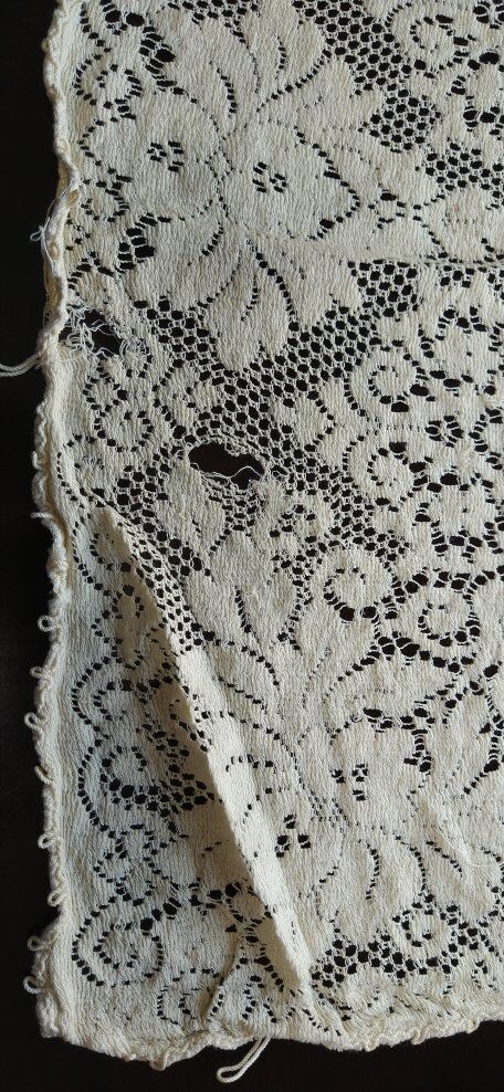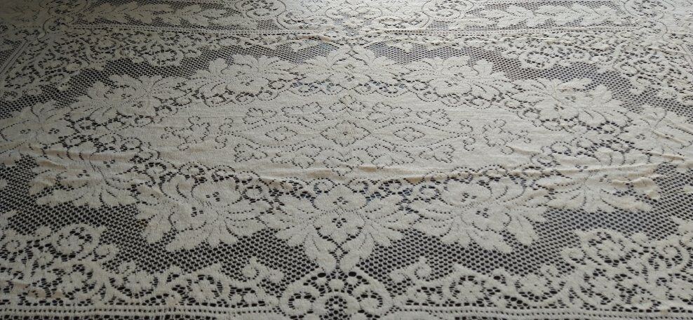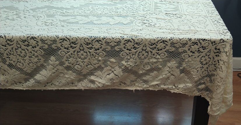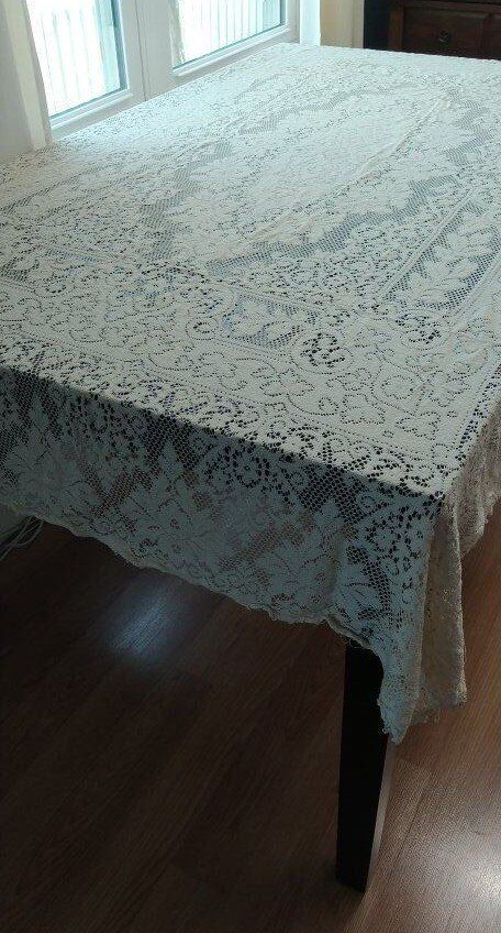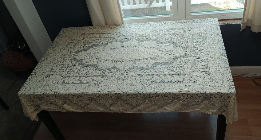 78 x 54 inches. Cream colored, very soft. No discoloration, that I can see. It was my aunt's tablecloth.