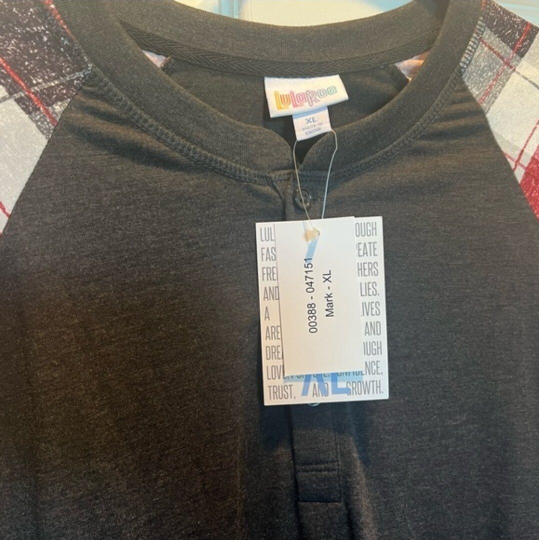Soft, lightweight knit fabric Button-front Henley neckline Contrasting plaid raglan sleeves Relaxed, flattering fit Perfect for layering