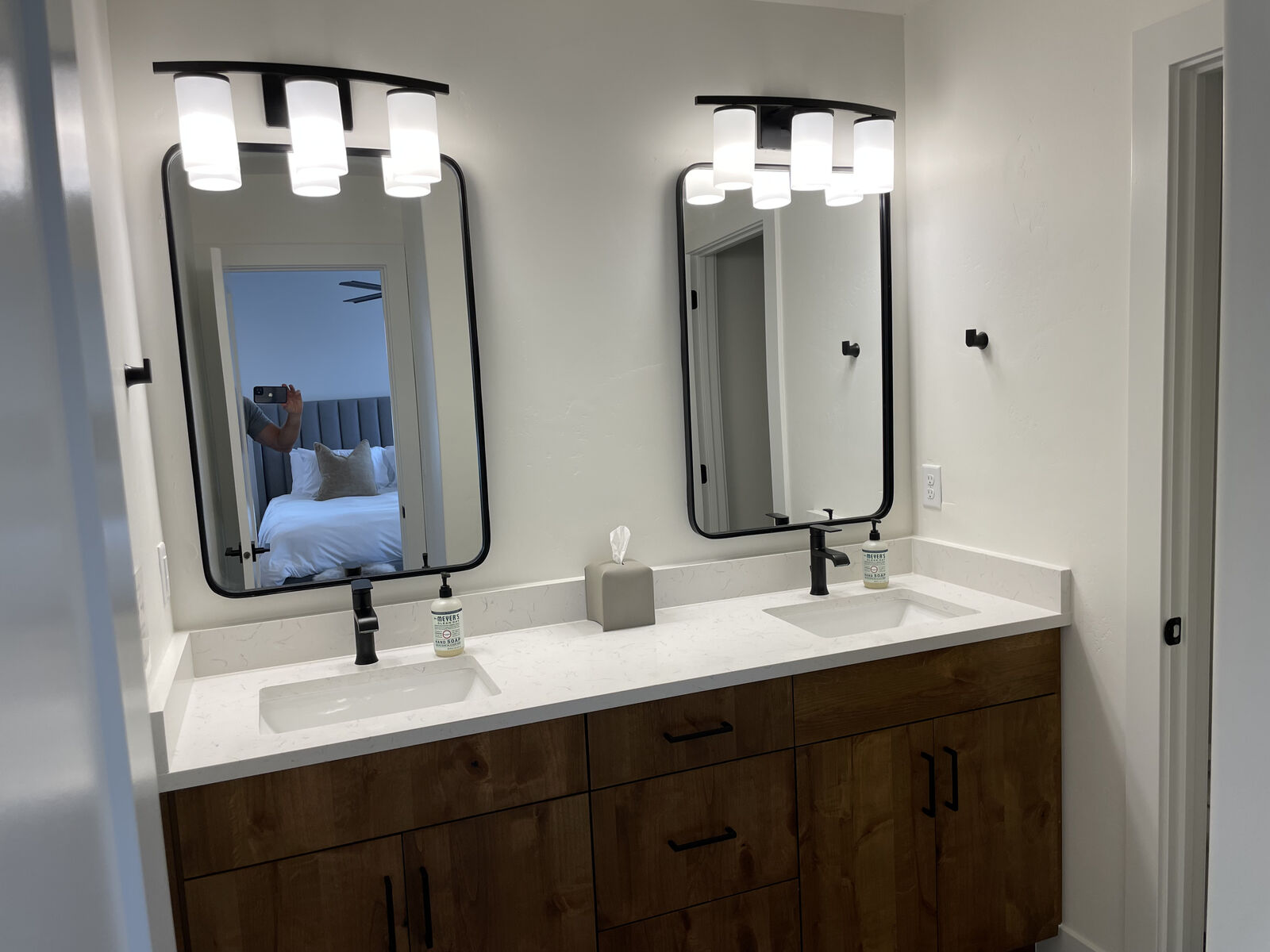 This immaculate 4-bedroom 3.5-bathroom home can comfortably sleep 12 people in king/queen beds (or) with the use of the portable tri-fold memory foam pillow toppers, sleep as many as 16 people for your desert getaway! The two master bedrooms each have a king bed and a large smart TV and an ensuite bathroom with two sinks, a bathtub, and a shower. The other two bedrooms include bunkbeds with two queens in each room. The living room and kitchen area feature plenty of light and upscale furnishings and décor, making Red Cliffs Haus in Escondido an enjoyable way to escape your day-to-day routine. Come relax, adventure, and make memories with all your favorite people!