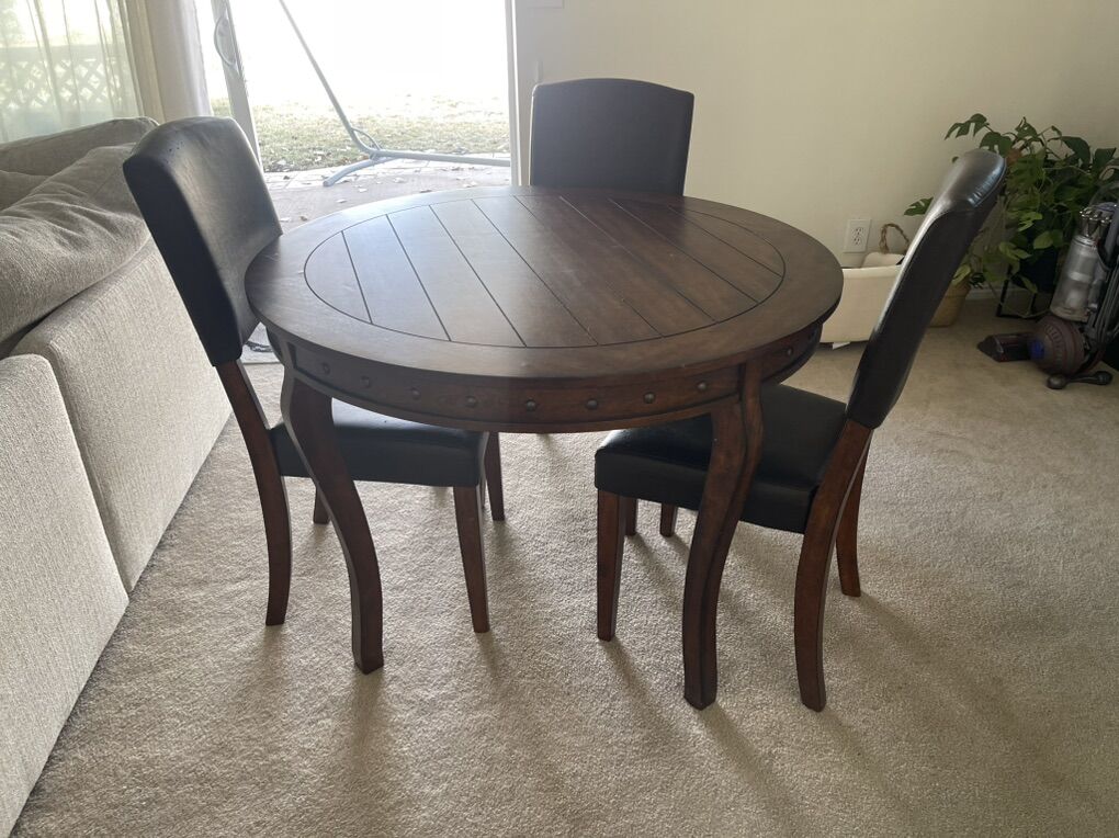 It’s a used table that would be great for a small area or if you’re looking for a game night table (it’s great for poker). It’s small enough for everyone to be close to each other but big enough to not be crowded when playing board games. The chairs have damage from a cat so they are included with the table and work fine for their purpose but I’d replace them if you wanted this as a dining table. The table measures 3.5’ diameter and 2.5’ tall.
