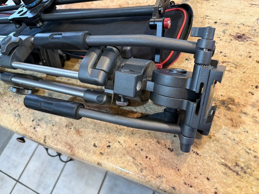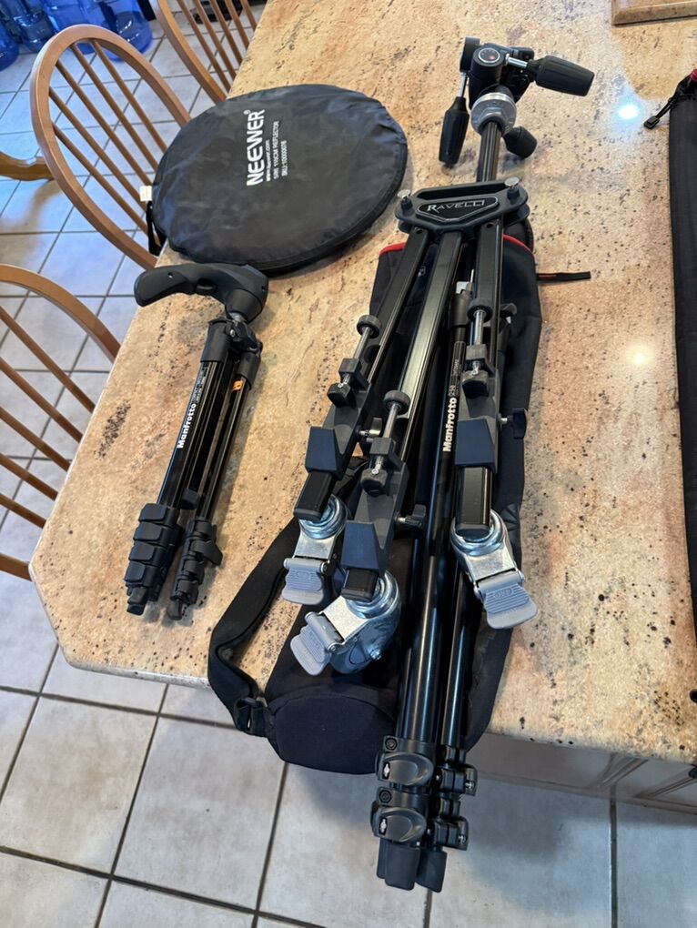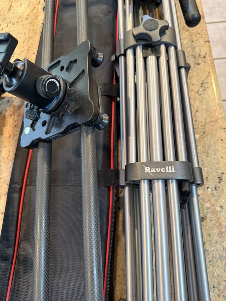 VenmoTwo Manfrotto tripods (MT 294A3 and compact MKC3-H01) and a Ravelli tripod with slider and dolly legs for capturing that smooth moving shot.
