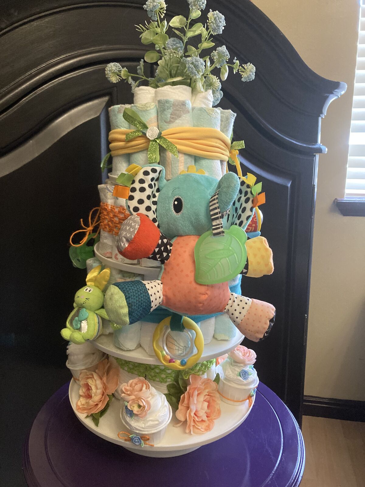 Pics 1-4: 4 tier diaper cake on a white stand! 4 headbands around the diapers, baby rattles & toys attached, binkie, cute diaper cupcakes on the bottom tier! $70