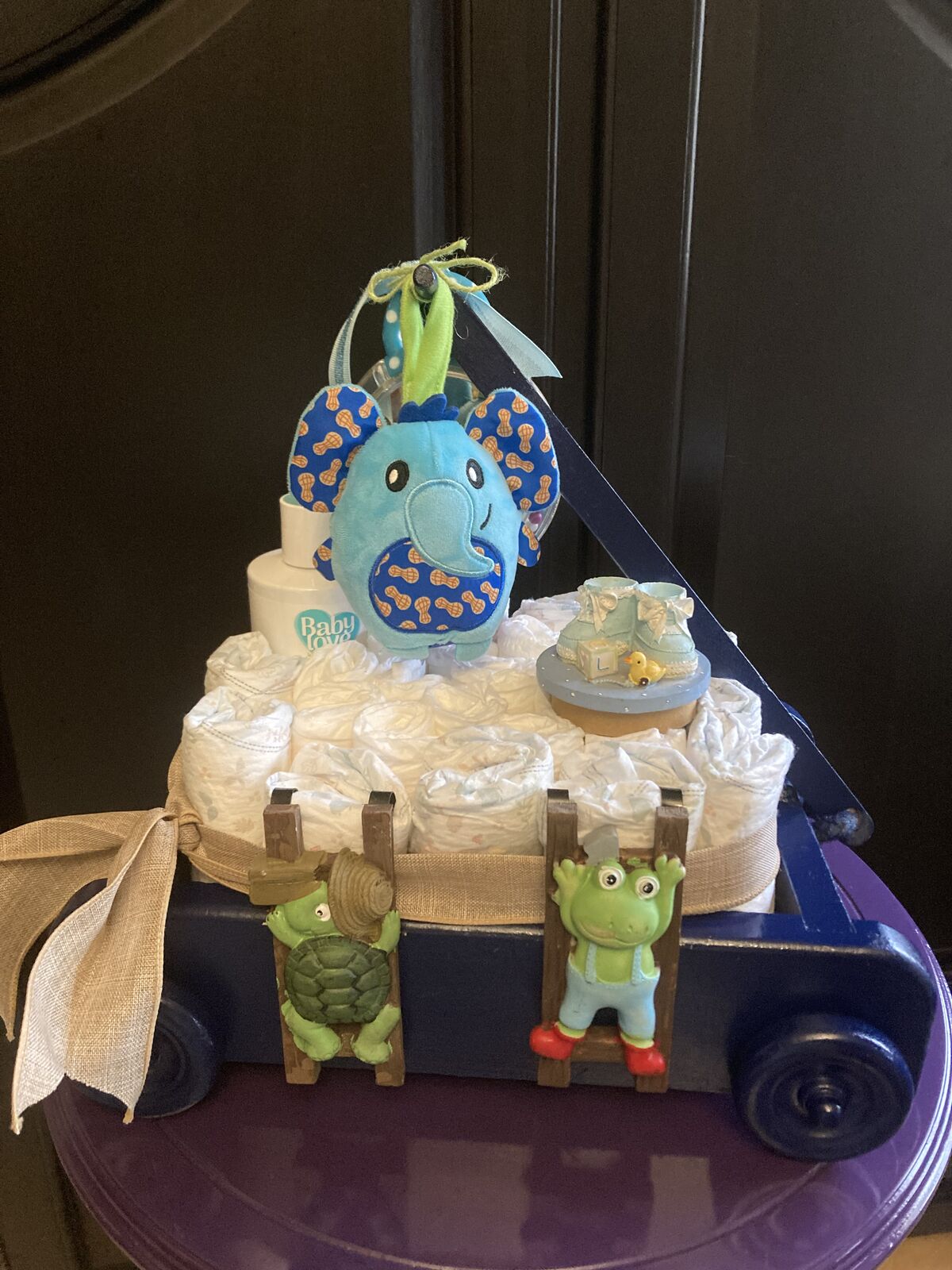 Pic 9: 1 tier navy blue wagon diaper cake, has 2 baby toys tied on the handle, some bottom to top baby wash in the wagon! $45