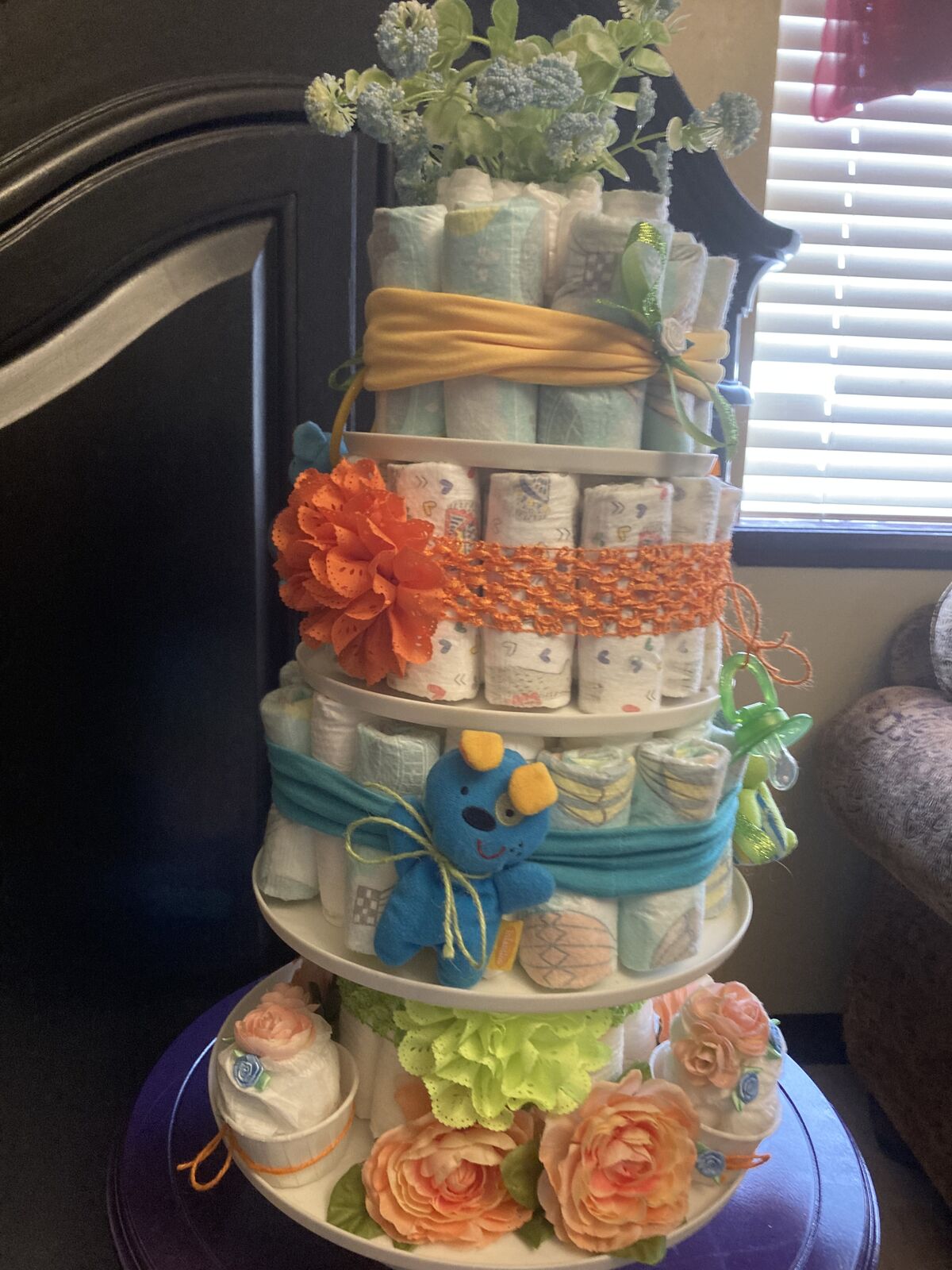 Pic 14 & 15: 2 tier vintage plate stand, diaper cake, purple pacifier, 3 hair bows, butterfly wings on top $50.