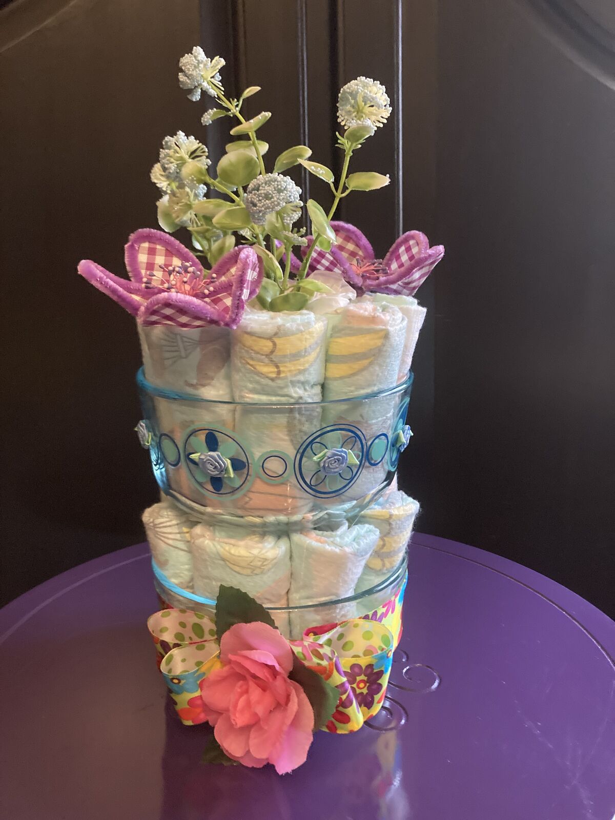 Pic 7 & 8: 2 tier diaper cake with flowers, the diapers are in glass bowls stacked on top of one another! $22