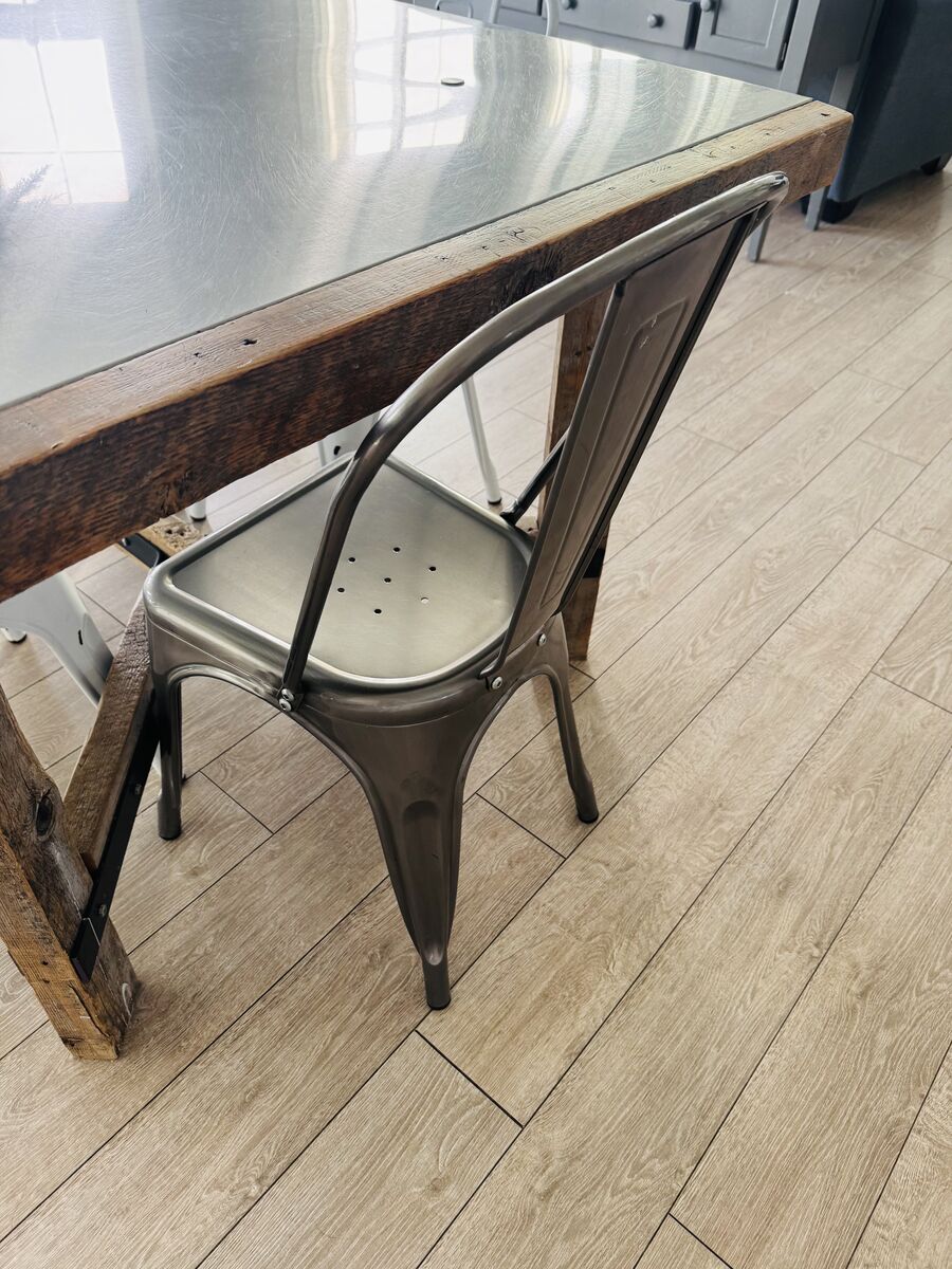 The table features a thick wood base with a dark metal top, giving it a modern farmhouse / industrial look that works well in both rustic and contemporary homes. It’s sturdy, durable, and built to last. The metal top is easy to clean and holds up great to everyday use.