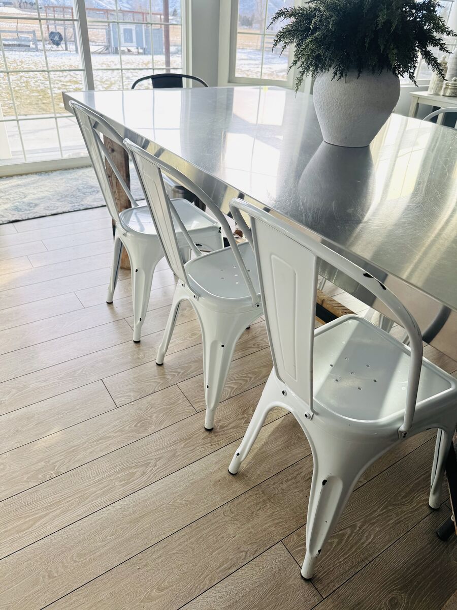 VenmoCustom-made farmhouse dining table with 8 metal chairs (6 white + 2 silver). This is a solid, heavy, beautifully built piece that comfortably seats 8 people — perfect for large family dinners, holidays, or hosting friends.