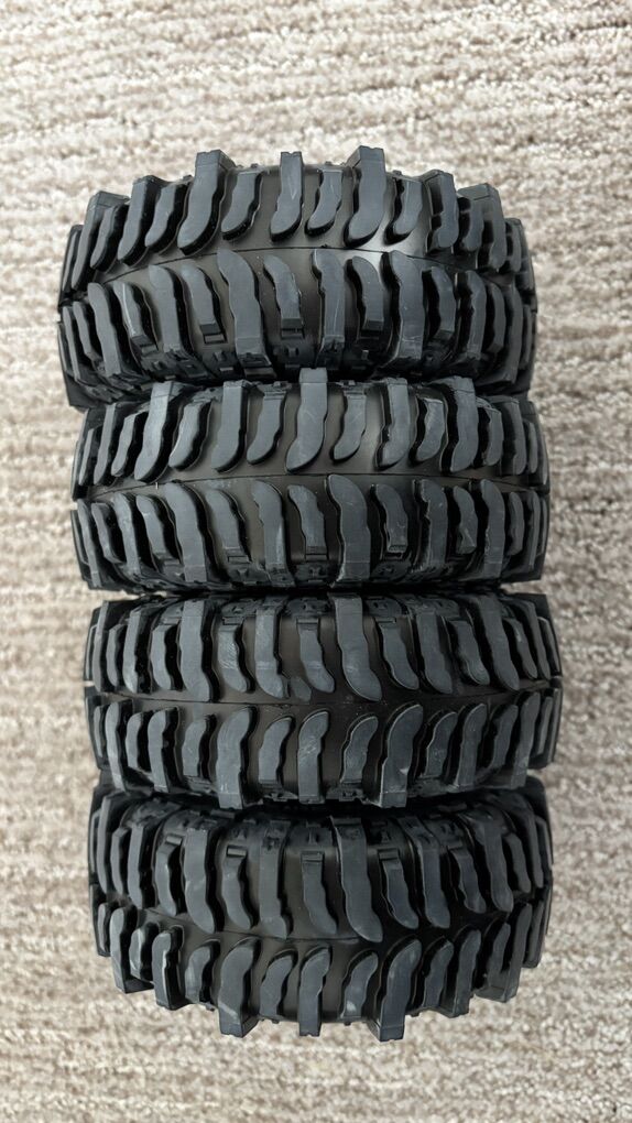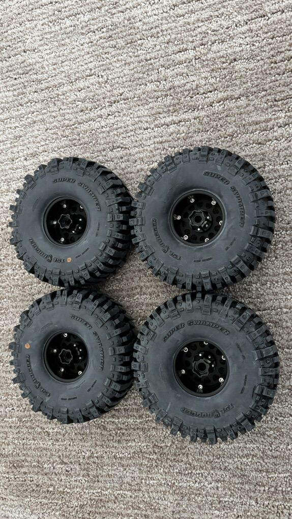 VenmoNever ran, Proline 1.9” 5.5” tall TSL Boggers on chinese 1.9 beadlock wheels with wide hexes.