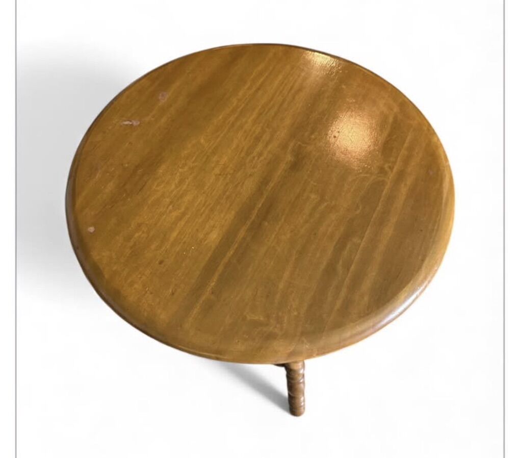 Venmo30 inches excellent condition maybe maple not sure it's very old. 26 wide. This vintage-style wooden end table features a round top, twisted legs, and a scalloped lower shelf.