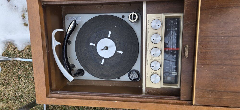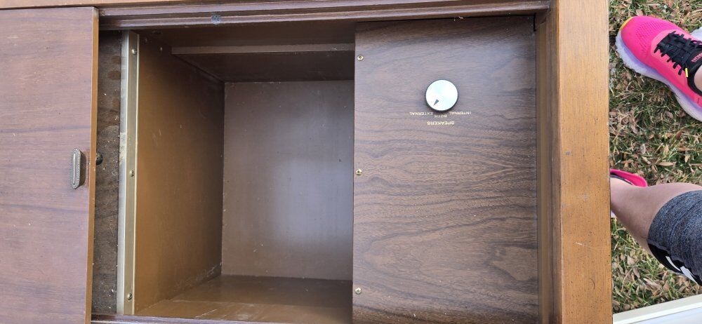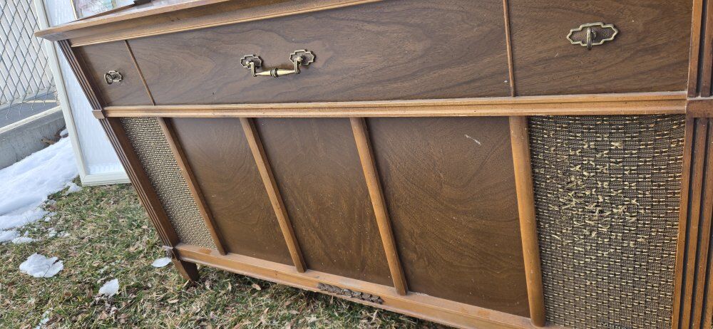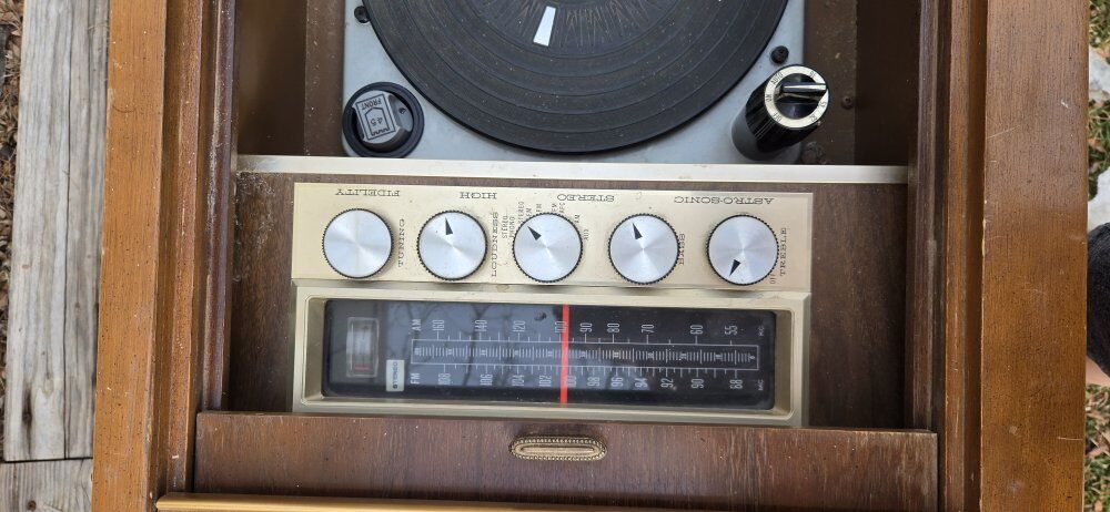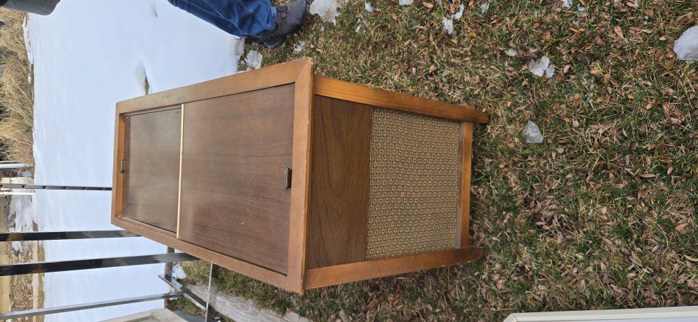 45 wide 17.5 deep 26" tall vintage Magnavox Astro-Sonic console stereo, likely from the 1960s, featuring a walnut cabinet designed in a classic mid-century style. It typically includes a turntable for playing records and an AM/FM radio tuner, and it may require restoration of the mechanical record changer components to function properly. Has needle turntable turns radio work. Have not listened to a record on it. Pick up in smithfield or will drop off in utah between smithfield & Spanish fork off of I-15 with venmo. Fcfs venmo to hold