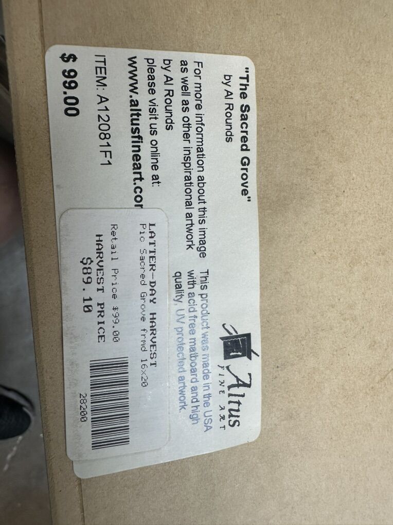 CashAppProduct Details Artist: Al Rounds, known for his historical and religious paintings. Subject: The Sacred Grove in Palmyra, New York, which is highly significant in the Latter-day Saint (Mormon) tradition as the site of Joseph Smith's First Vision in 1820. Specifications: This specific item (A12081F1) is a 16x20 framed print made with acid-free matboard and UV-protected artwork. Pricing: The retail price shown on the label is $99.00, with a Harvest Price of $89.10. Call or text John at 801-455-9156