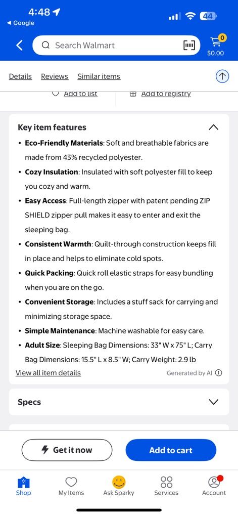 • Adult size – approx. 33” W x 75” L • Rated for temperatures around 50°F (great for spring/summer camping) • Full-length zipper • Lightweight and easy to roll up and store • Machine washable